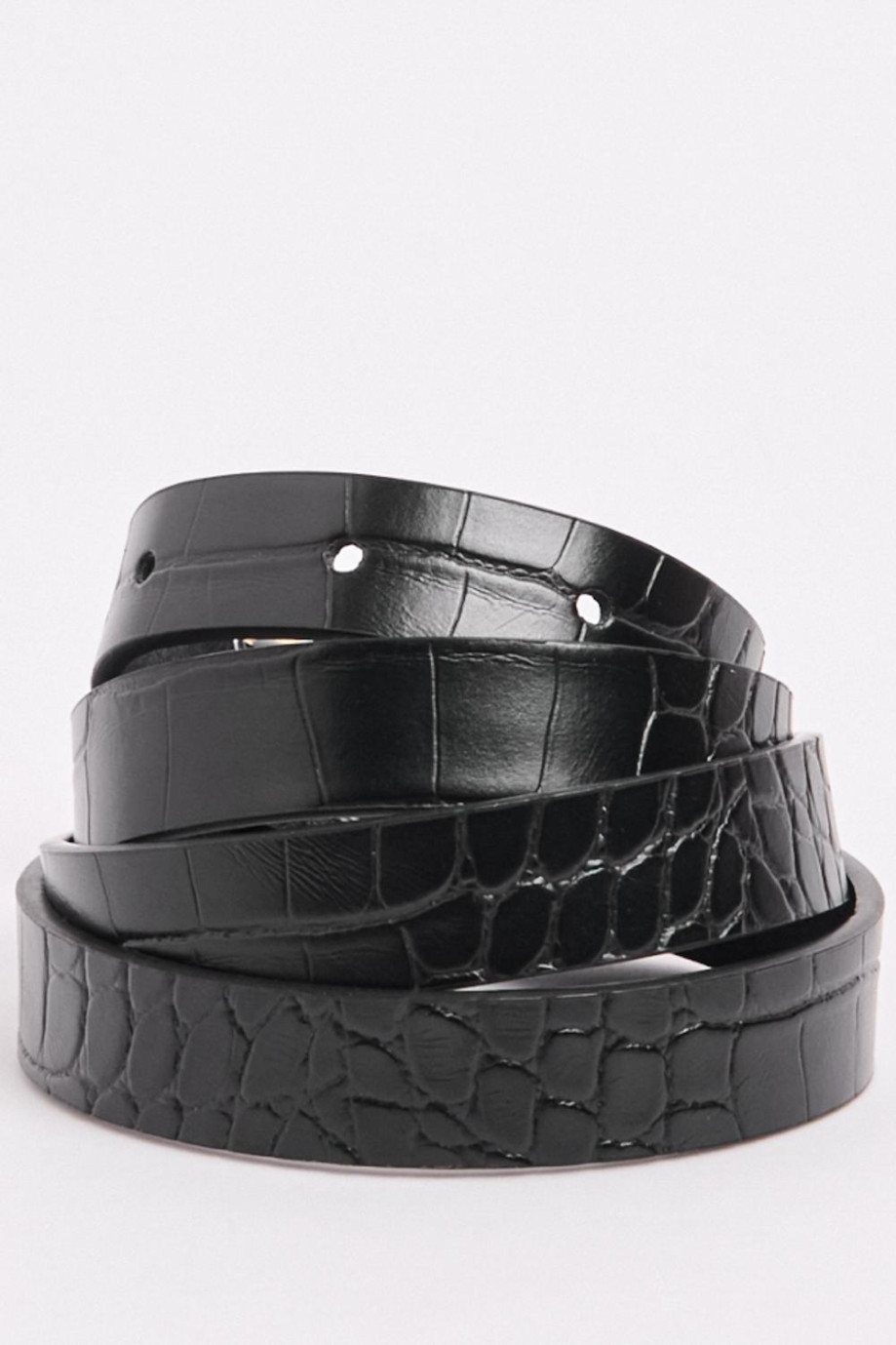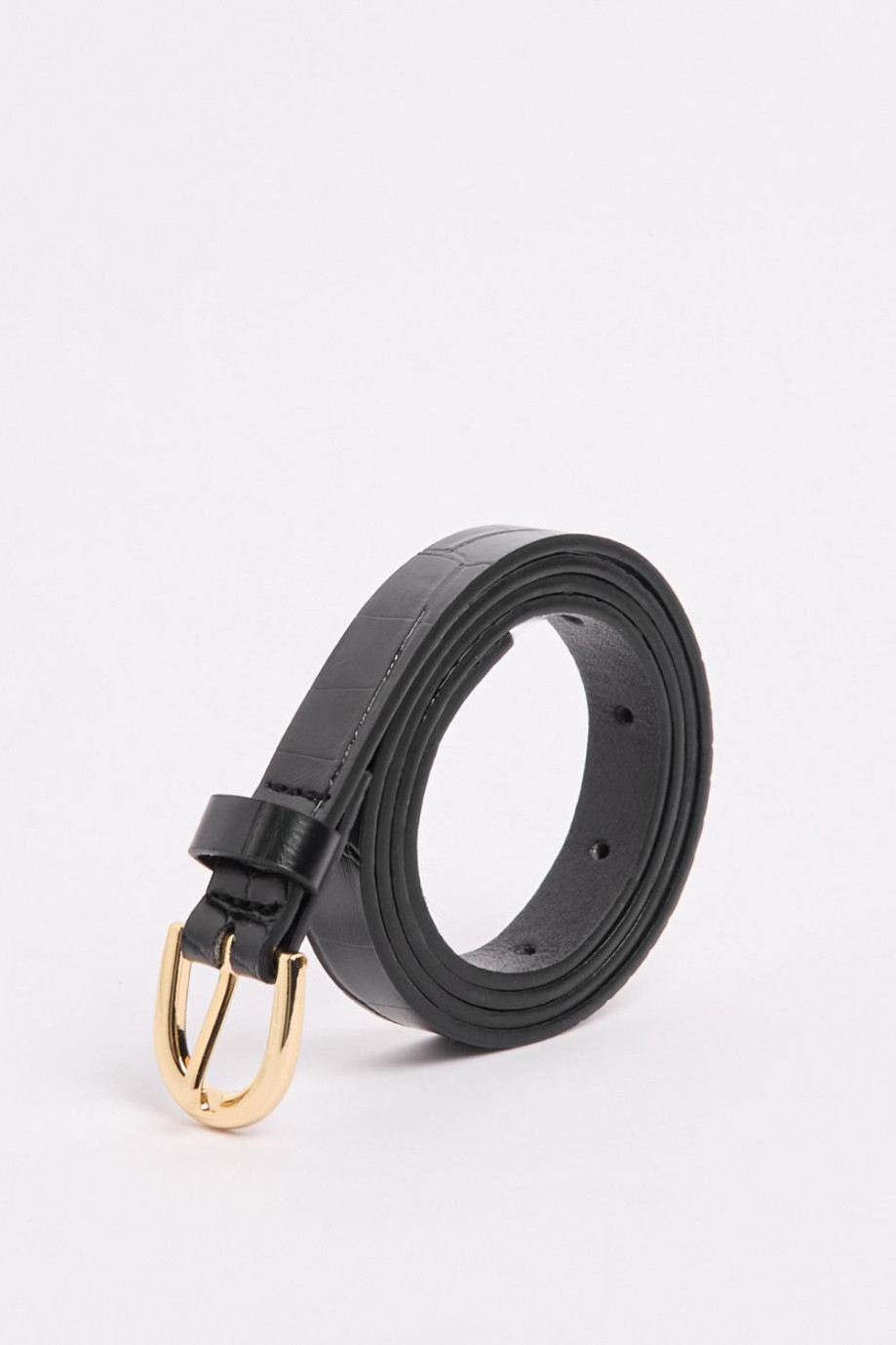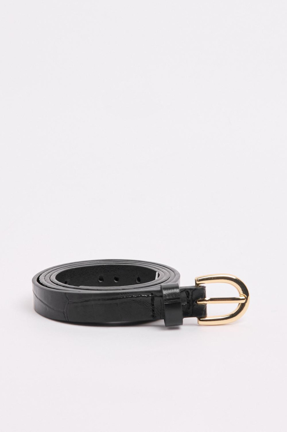 Cinturón negro con texturas tipo reptil y hebilla dorada