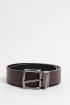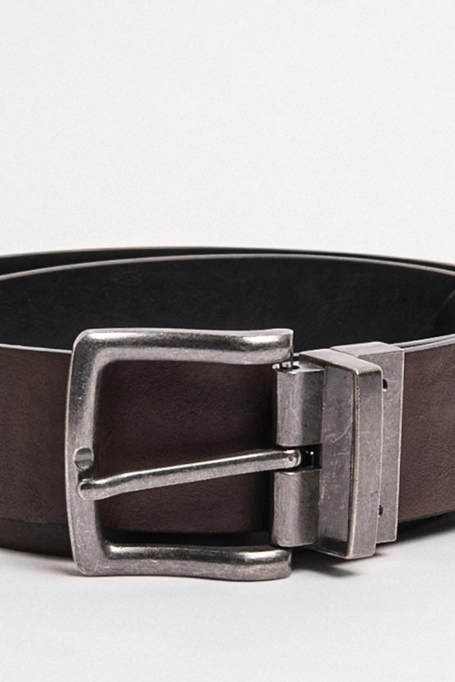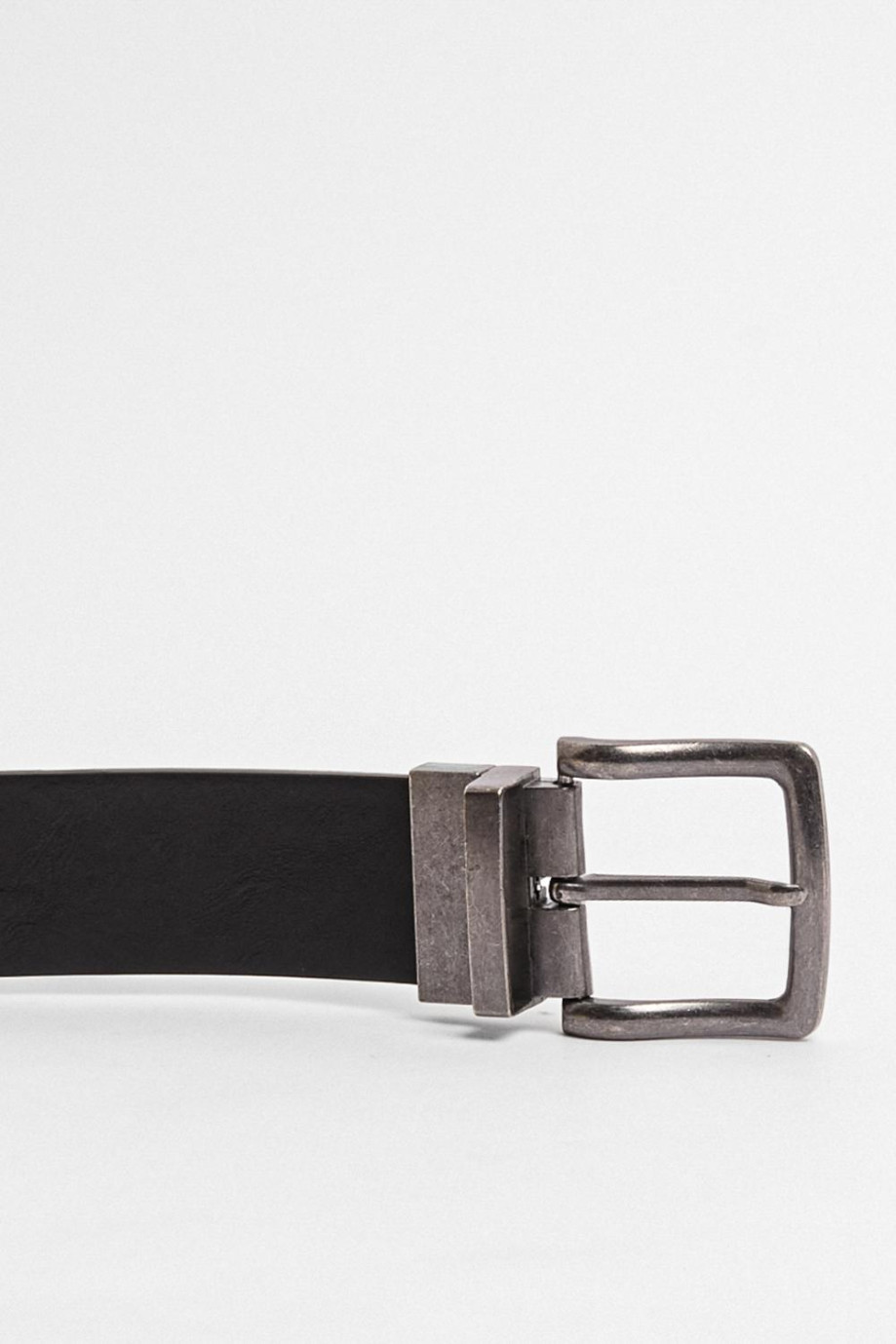 Cinturón para hombre en tono negro cuenta con parte reversible café, textura lisa y hebilla cuadrada metálica con trabilla incorporada. Crea looks estilizados luciendo este accesorio con tus pantalones en dril preferidos, así te destacarás en tus ocasiones más especiales.