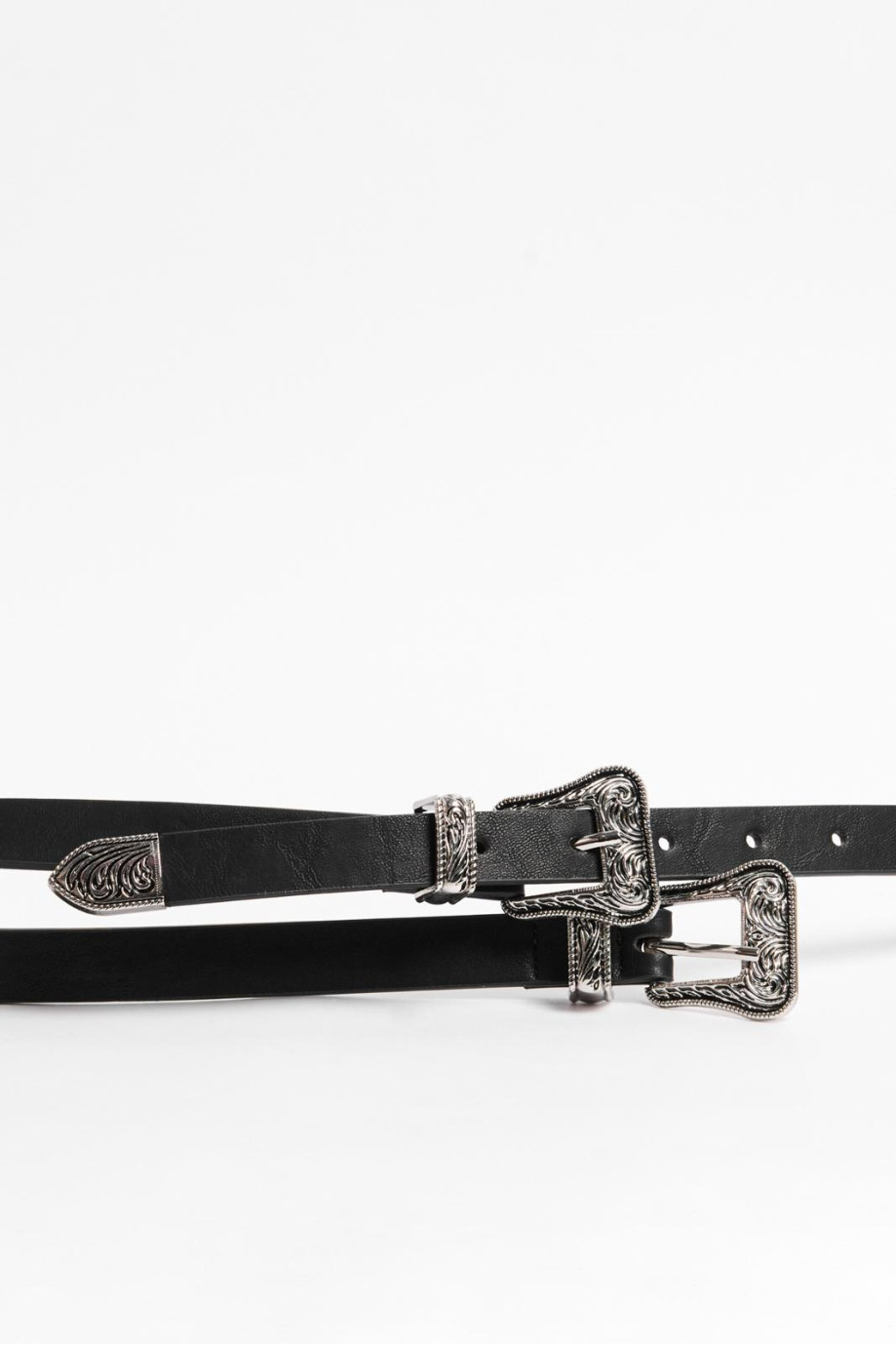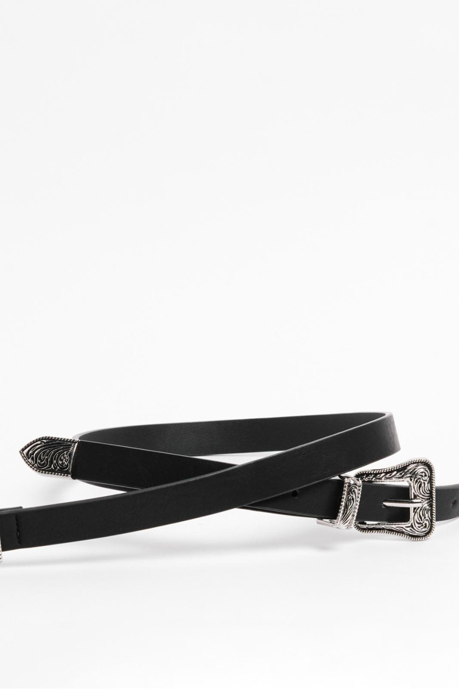 Cinturón para mujer en tono negro, elaborado en material sintético, cuenta con hebilla metálica contramarcada, textura lisa y trabilla sencilla. Este accesorio tiene un estilo moderno que podrás combinar con tus jeans o vestidos KOAJ favoritos y lucir en todos tus planes con amigos.
