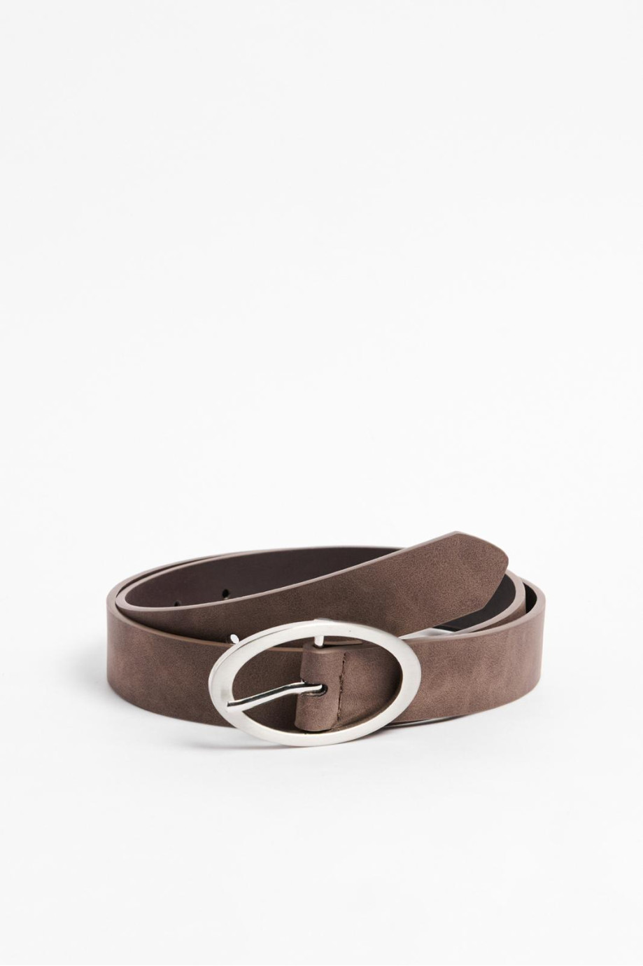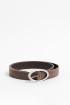 Cinturón café oscuro con hebilla ovalada plateada