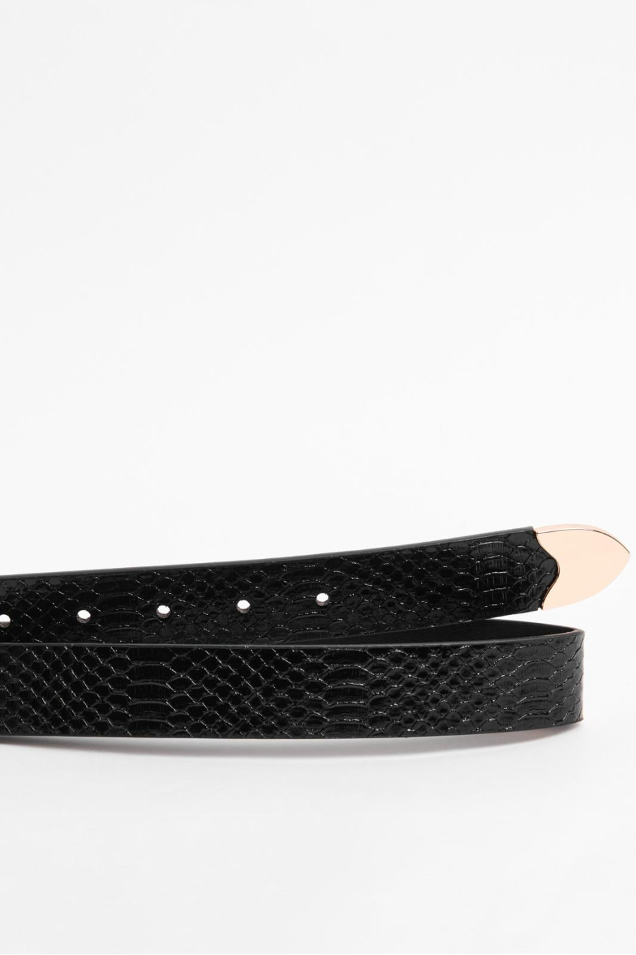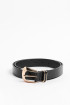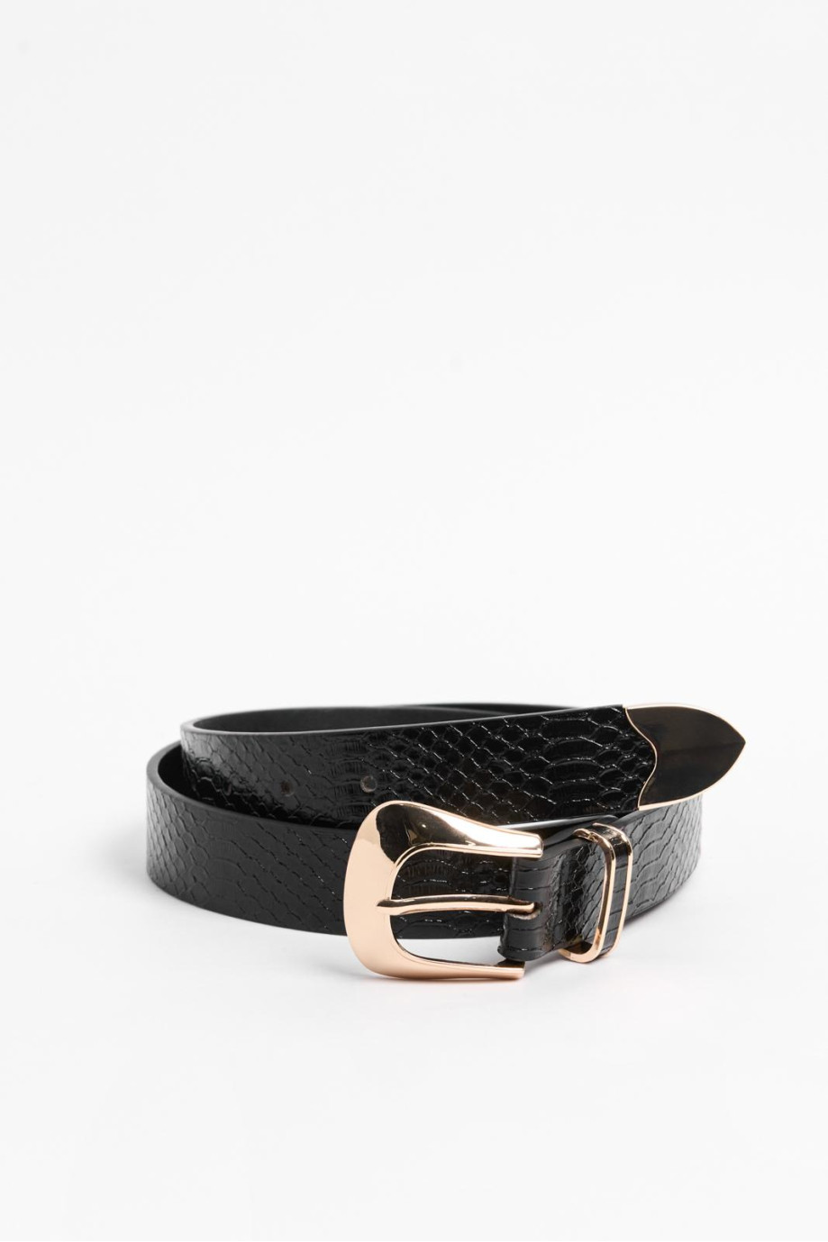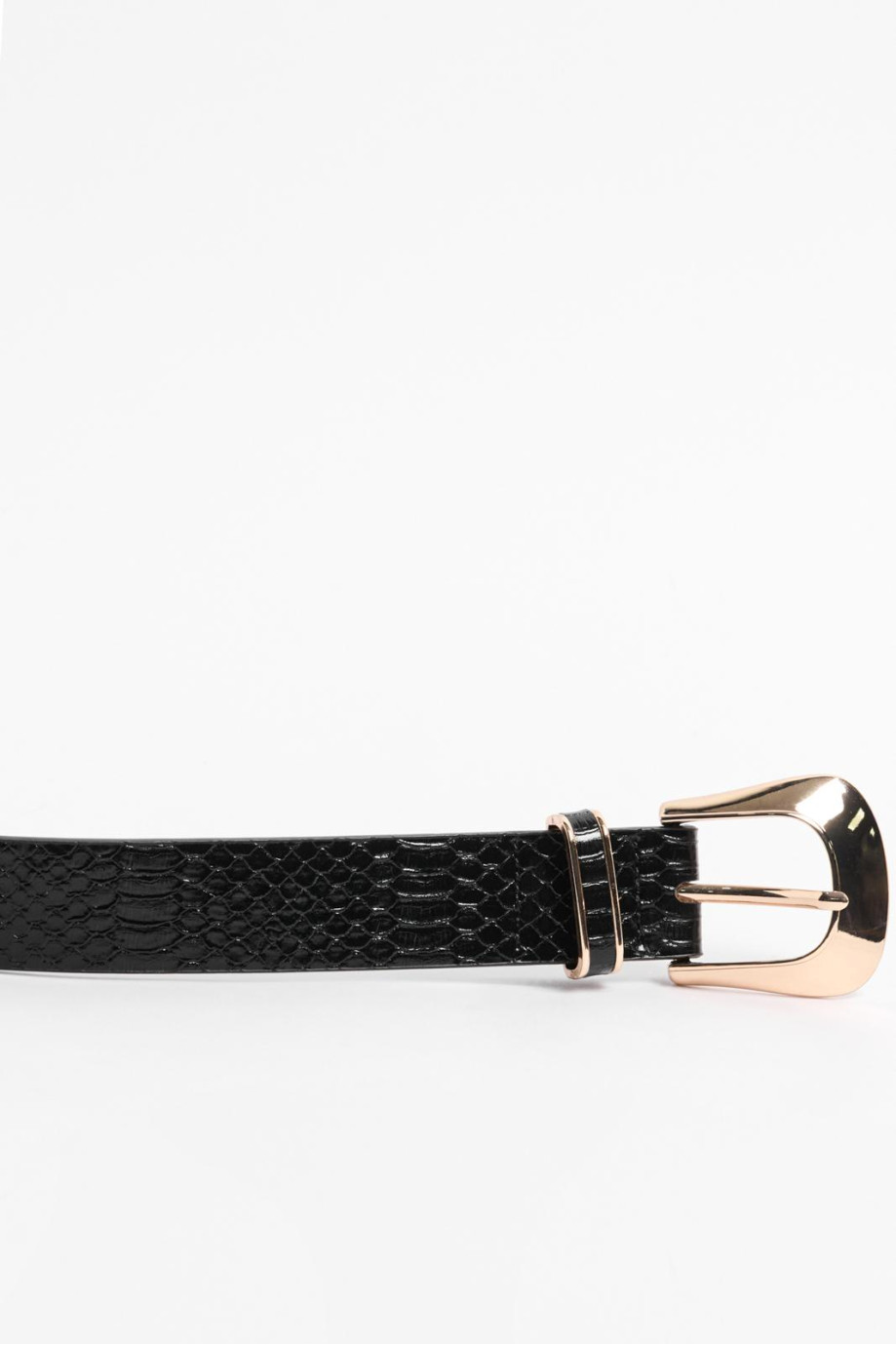 Cinturón para mujer en tono negro, elaborado en material sintético, cuenta con hebilla dorada cuadrada con aguja, detalles con texturas de reptil y trabilla sencilla. Dale a tu total look un estilo único luciendo este accesorio, será perfecto para combinar con tus jeans o vestidos preferidos.