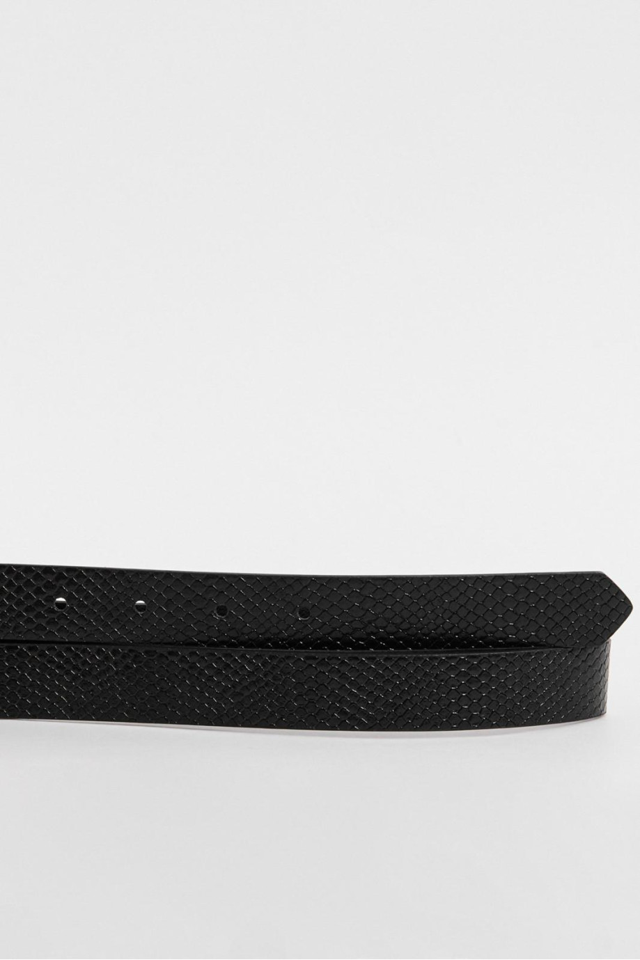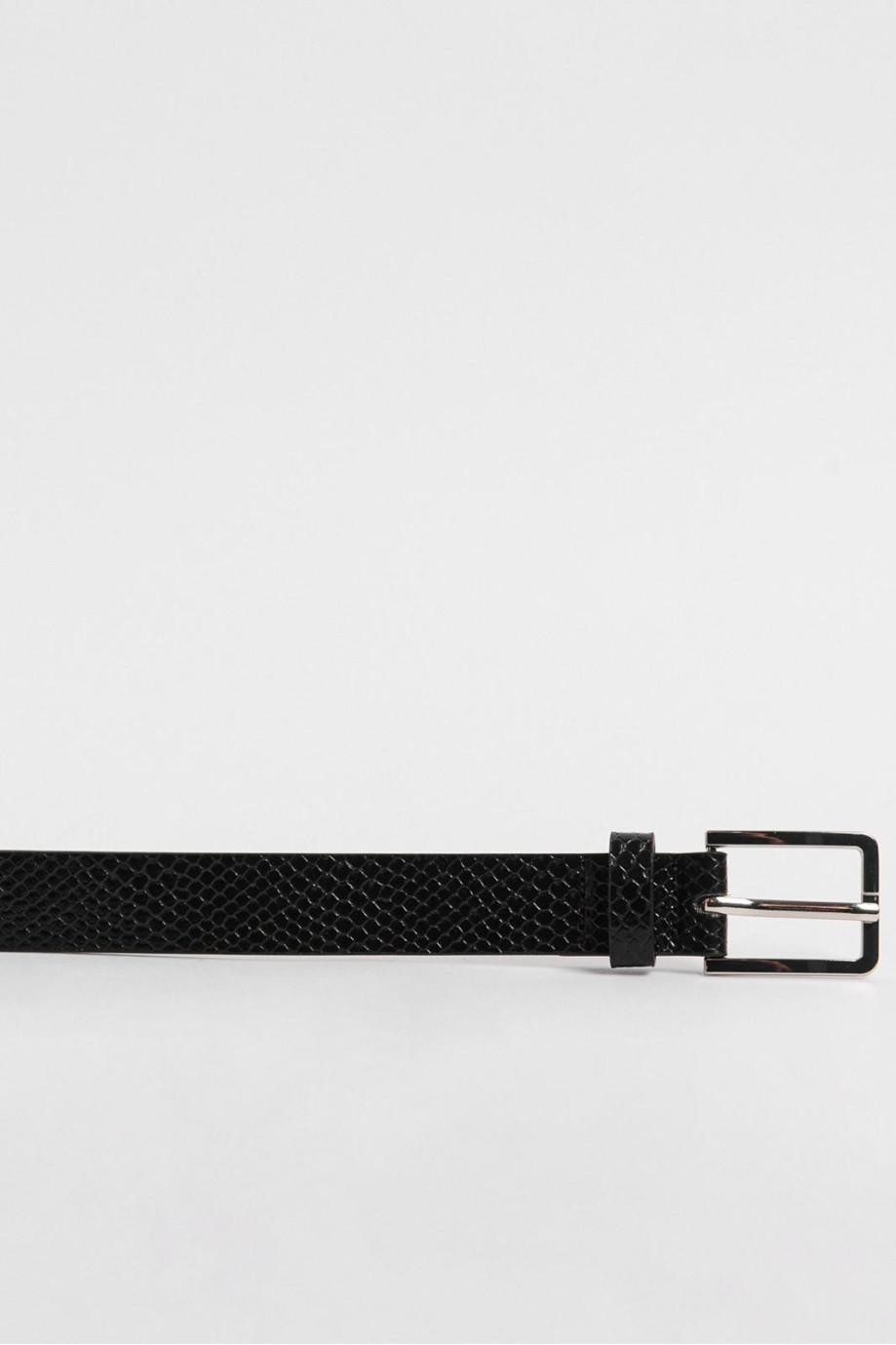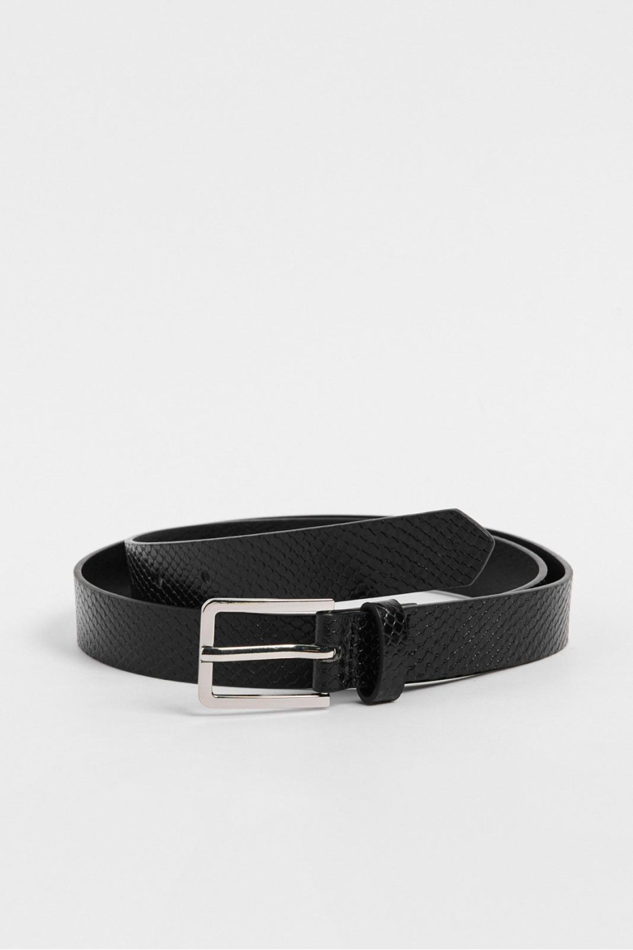 Cinturón para mujer en tono negro, elaborado en material sintético, cuenta con hebilla cuadrada metálica plateada, trabilla sencilla y detalles con texturas de reptil. Crea looks estilizados luciendo este accesorio con tus faldas o jeans KOAJ preferidos. ¡Serás la sensación!
