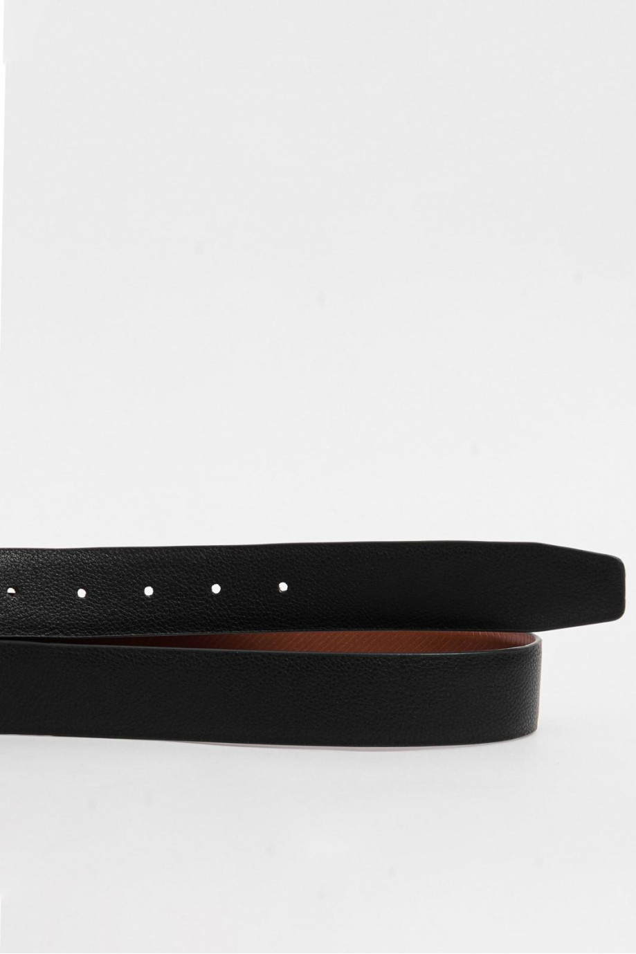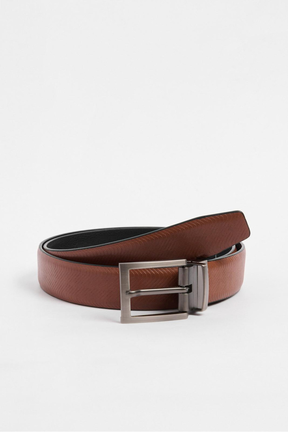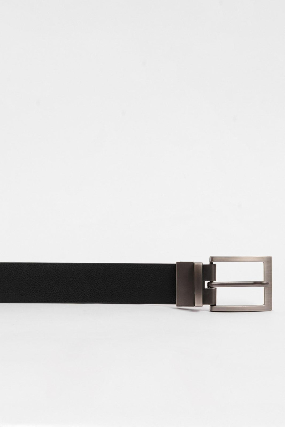 Cinturón negro para hombre, elaborado en material sintético, cuenta con parte reversible café con texturas y hebilla cuadrada metálica con trabilla incorporada. Crea looks estilizados luciendo este accesorio con tus jeans KOAJ preferidos, así impactarás a los demás con tu estilo.