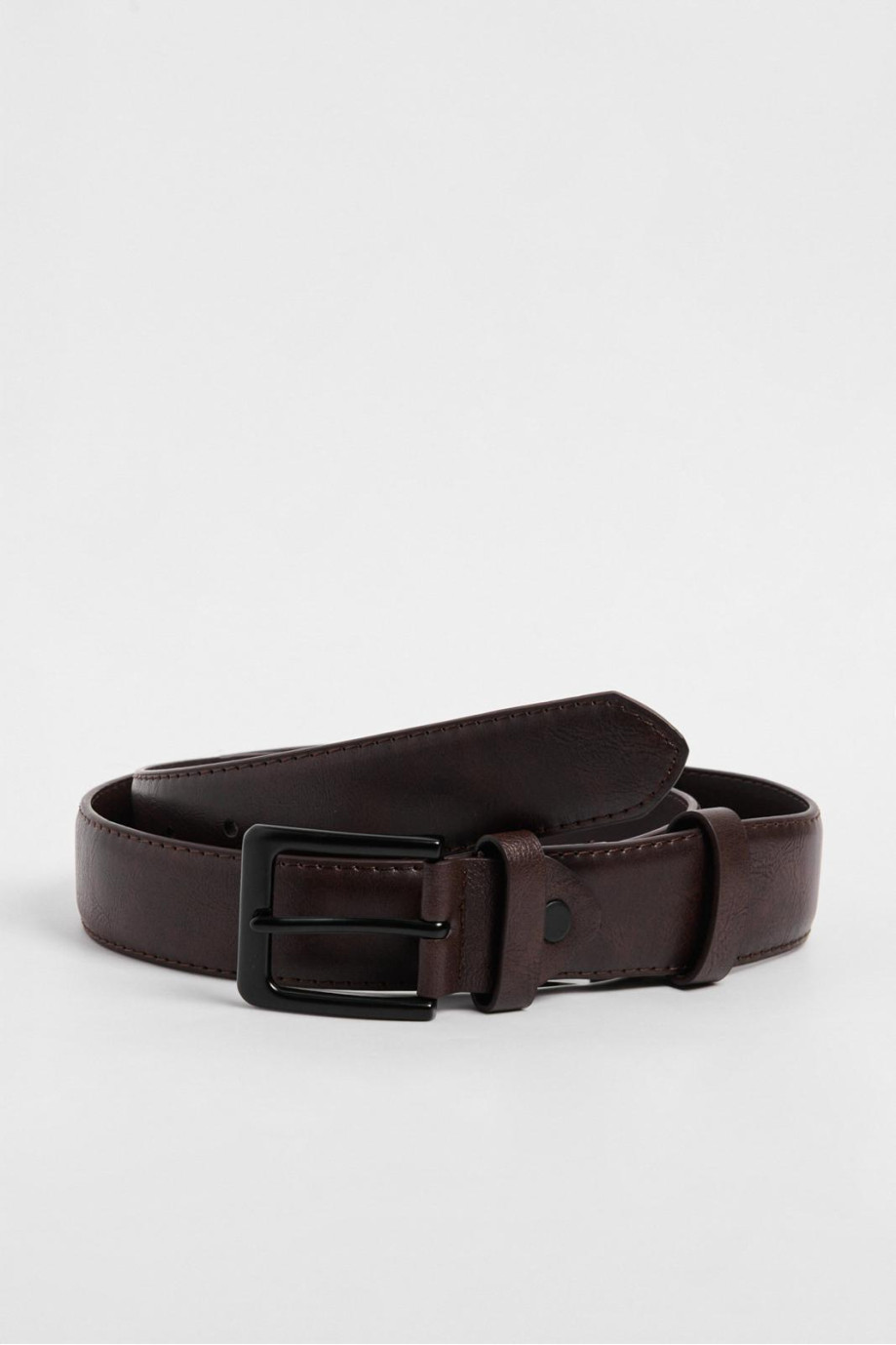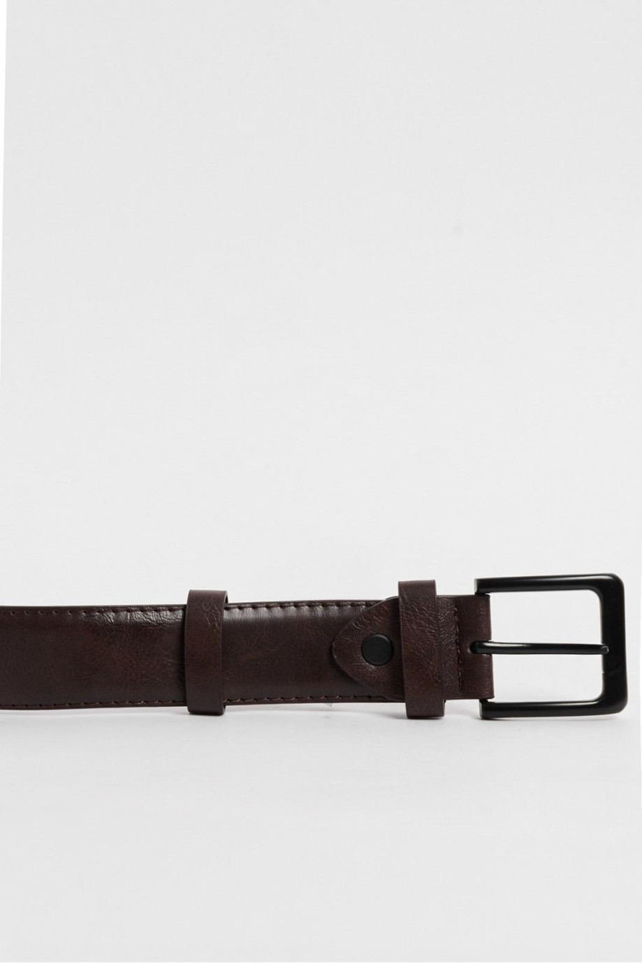 Cinturón para hombre en tono café oscuro cuenta con hebilla cuadrada metálica negra, doble trabilla y textura lisa. Este accesorio te sacará de apuros, lúcelo con tus pantalones de dril preferidos y crea cientos de atuendos hechos a tu medida.
