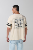 Camiseta cuello redondo kaki clara para hombre cuenta con diseños college en frente y espalda, manga corta con franjas en contraste, hombro caído y una horma oversize en el cuerpo. Si planeas salir con amigos esta es la prenda que debes llevar, combínala con un jean 90´S y crea un look con el que te identifiques.