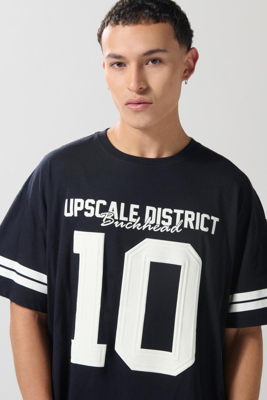 Camiseta azul intensa cuello redondo para hombre cuenta con diseño college delantero, manga corta con franjas blancas, hombro caído y una silueta oversize en el cuerpo. Crea un estilo urbano con esta prenda, un clásico que combinará muy bien con jeans 90´S, baggy o cargo.