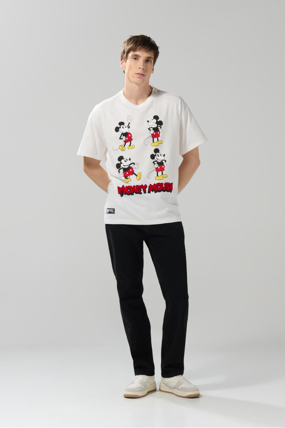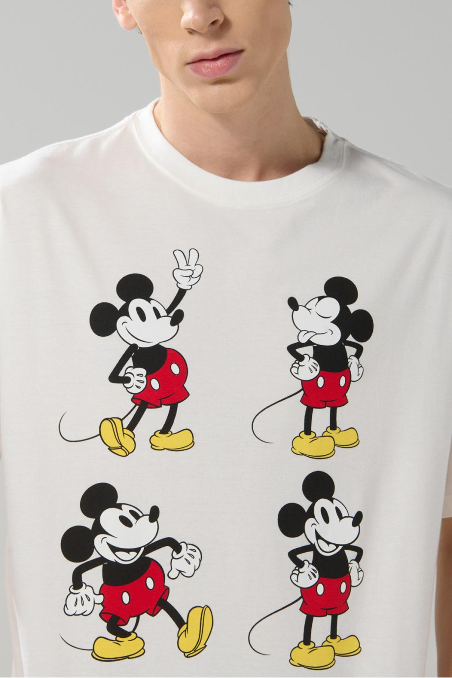 Camiseta manga corta crema clara para hombre cuenta con hombro caído, diseño de Mickey (Disney) localizado en frente, cuello redondo y una silueta oversize en el cuerpo. Lleva las últimas tendencias en tu total look combinando esta prenda con tu mejor jean. ¡Lucirás espectacular!
