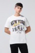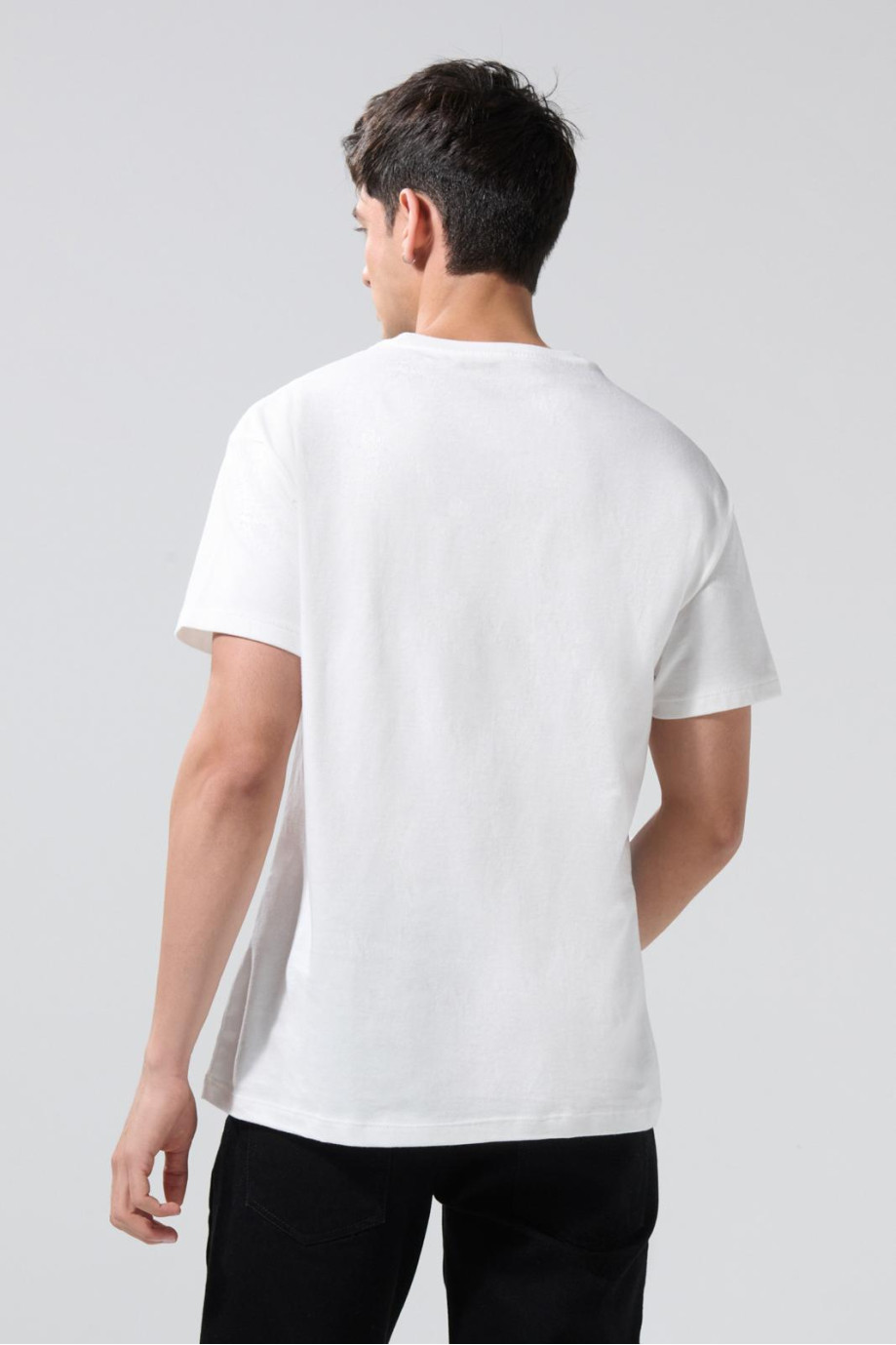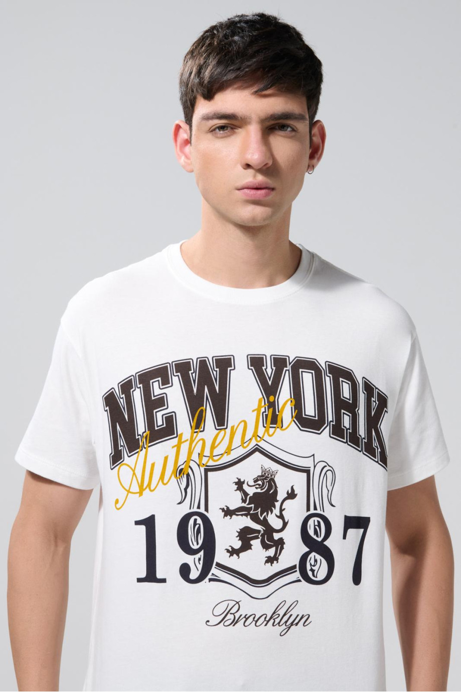 Camiseta manga corta para hombre en tono crema clara cuenta con diseño college estampado en frente, cuello redondo, hombro rodado y un fit ligeramente holgado en el cuerpo. Infaltable en tu guardarropa, podrás lucirla con tus bermudas favoritas y crear estilos con los que reflejes tu lado más relajado.