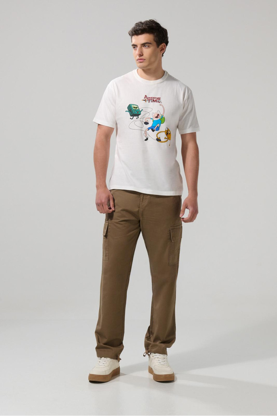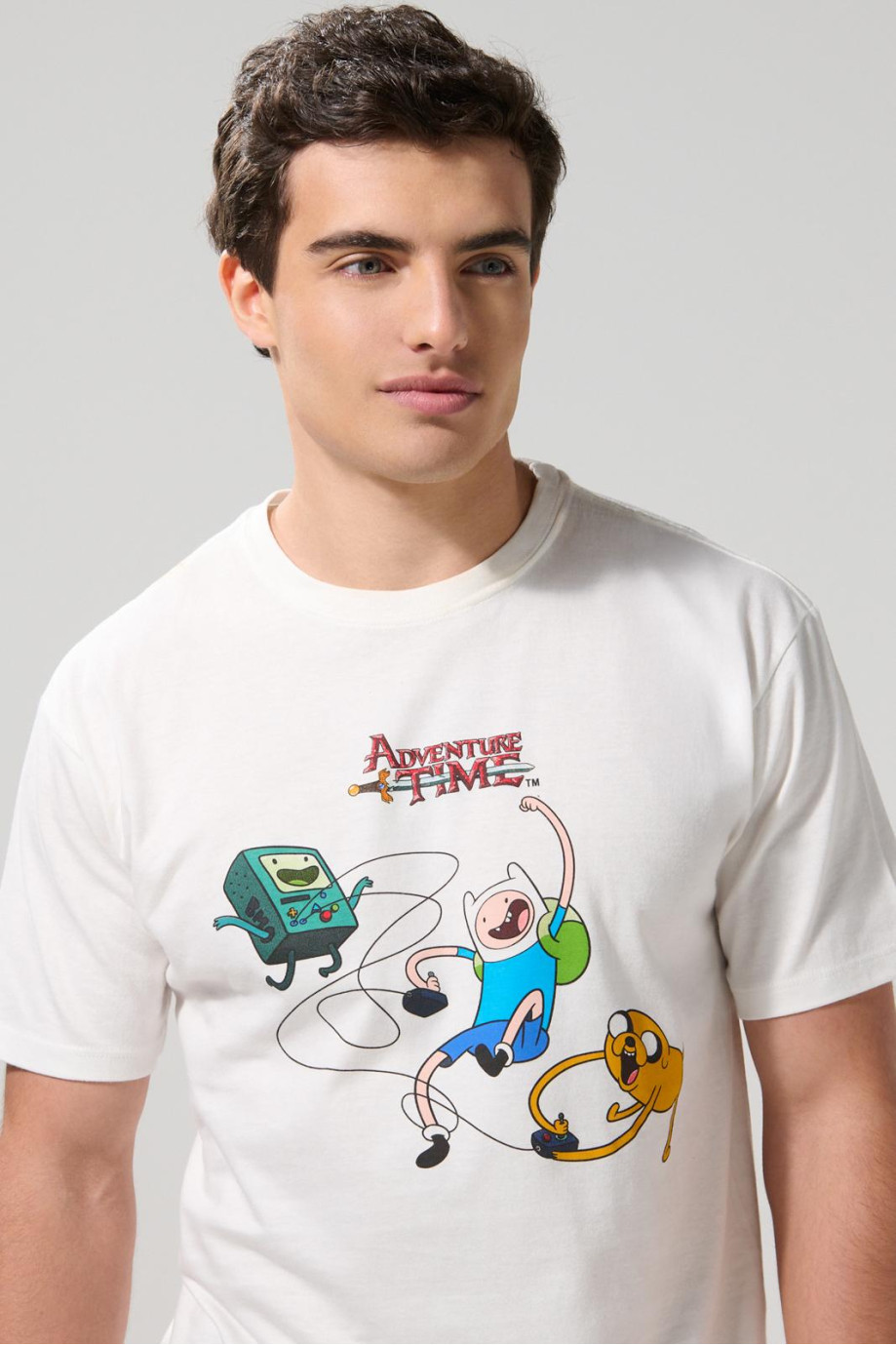 Camiseta crema clara para hombre cuenta con diseño de Hora de Aventura estampado en frente, cuello redondo, hombro rodado, manga corta y un fit ligeramente ajustado al cuerpo. ¡Esta prenda será tu opción favorita! Con una bermuda de jean crearás un outfit ideal para los días soleados.