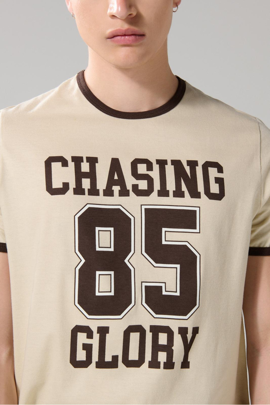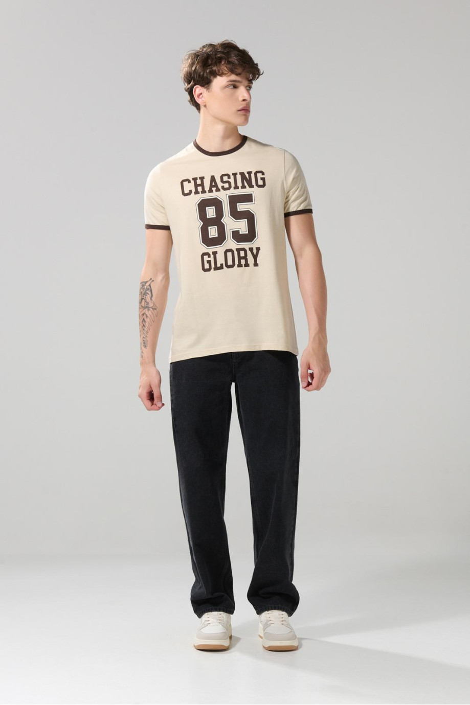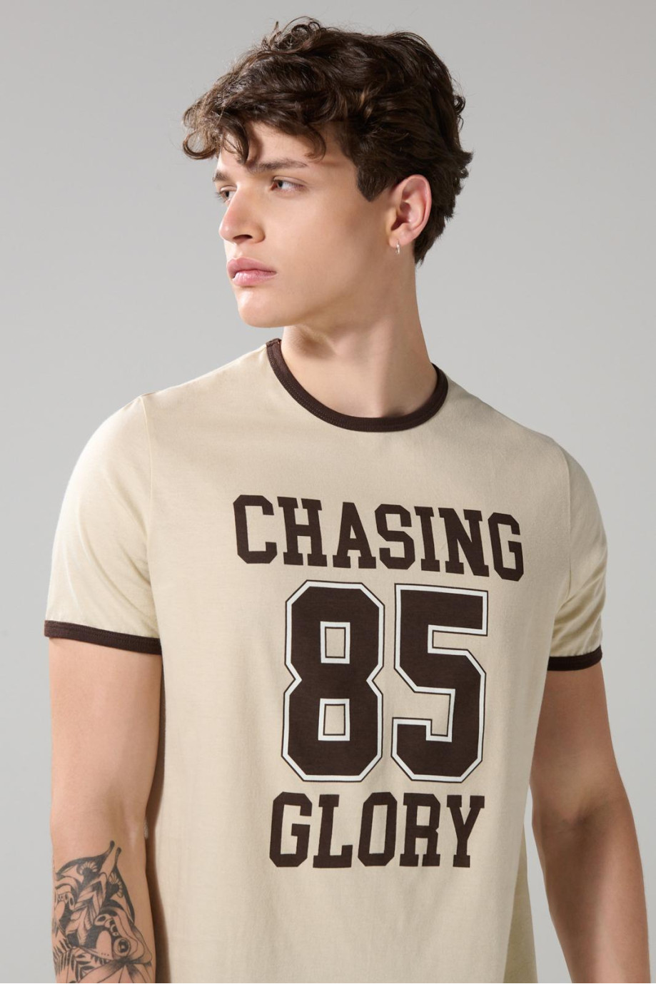 Camiseta para hombre en tono kaki clara cuenta con contrastes en cuello redondo y puños, manga corta, diseño college numérico localizado en frente y un fit ligeramente ajustado al cuerpo. Luce a la moda todos los días combinando esta prenda con un jean y un par de tenis. ¡Serás la sensación con tu look!