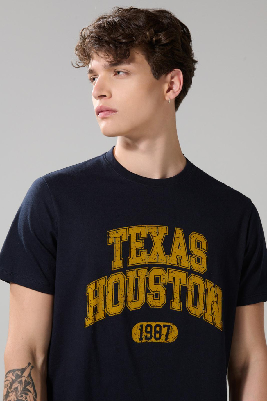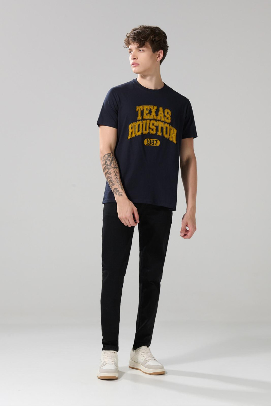Camiseta azul intensa cuello redondo para hombre cuenta con texto college amarillo estampado en frente, manga corta y un fit que se ajustará al cuerpo en la medida precisa. ¡Esta prenda está en tendencia! Lúcela con una bermuda de jean y llévala para salir en tus planes de fin de semana.
