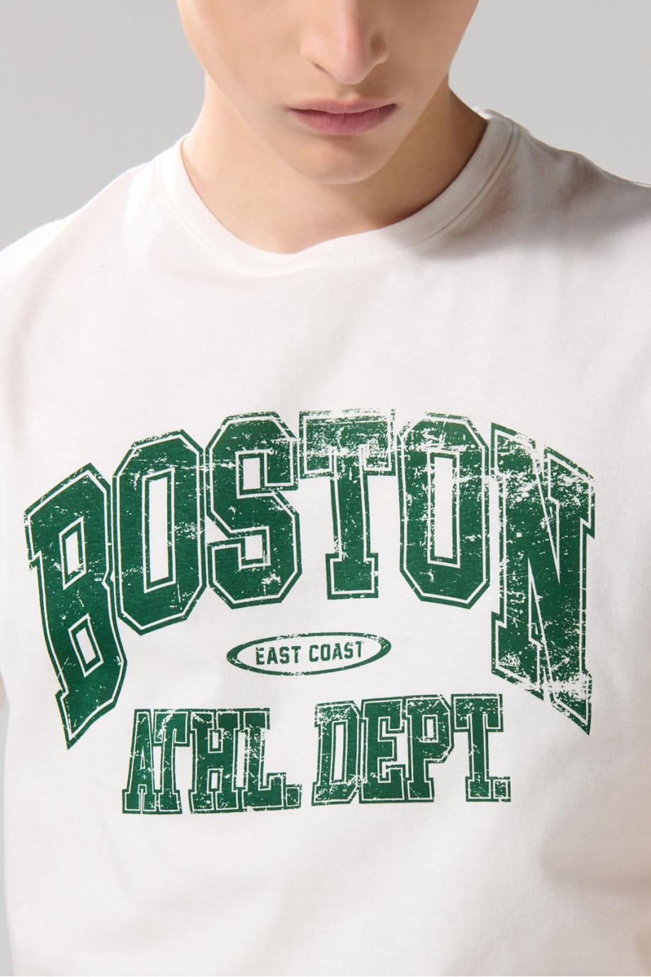 Camiseta cuello redondo para hombre en tono crema clara, confeccionada en tela de algodón y con un fit holgado, cuenta con hombro rodado, manga corta y diseño college delantero. Esta es una prenda fácil de combinar que debes tener, con una bermuda de jean y tus tenis Koaj favoritos crearás un look en tendencia.