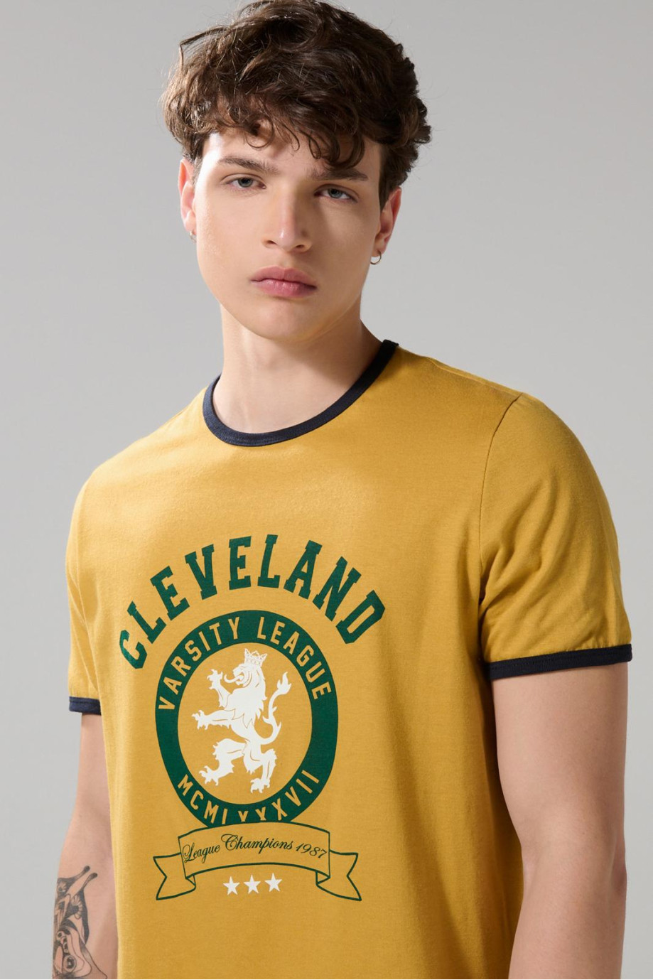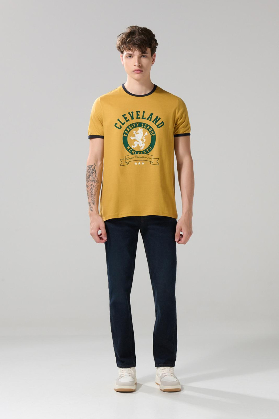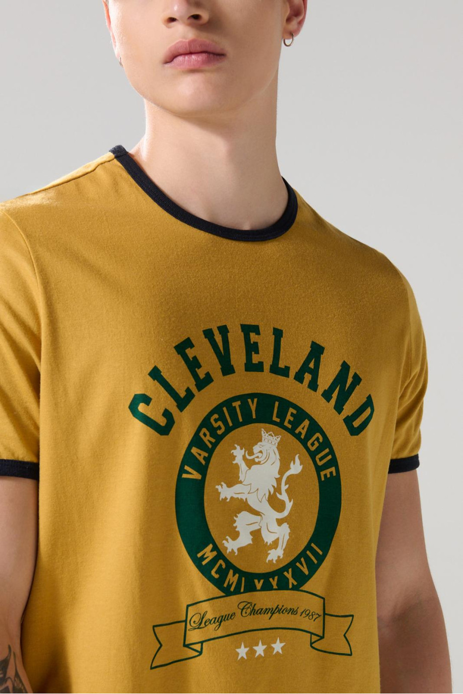 Camiseta manga corta amarilla oscura para hombre cuenta con contrastes verdes en cuello redondo y puños, diseño college localizado en frente y un fit ajustado al cuerpo. Arriésgate a crear un look juvenil combinando esta prenda con un jean y un par de tenis planos. ¡Marcarás la diferencia!