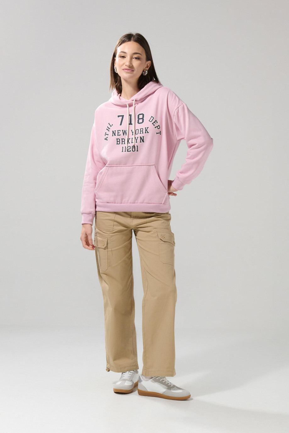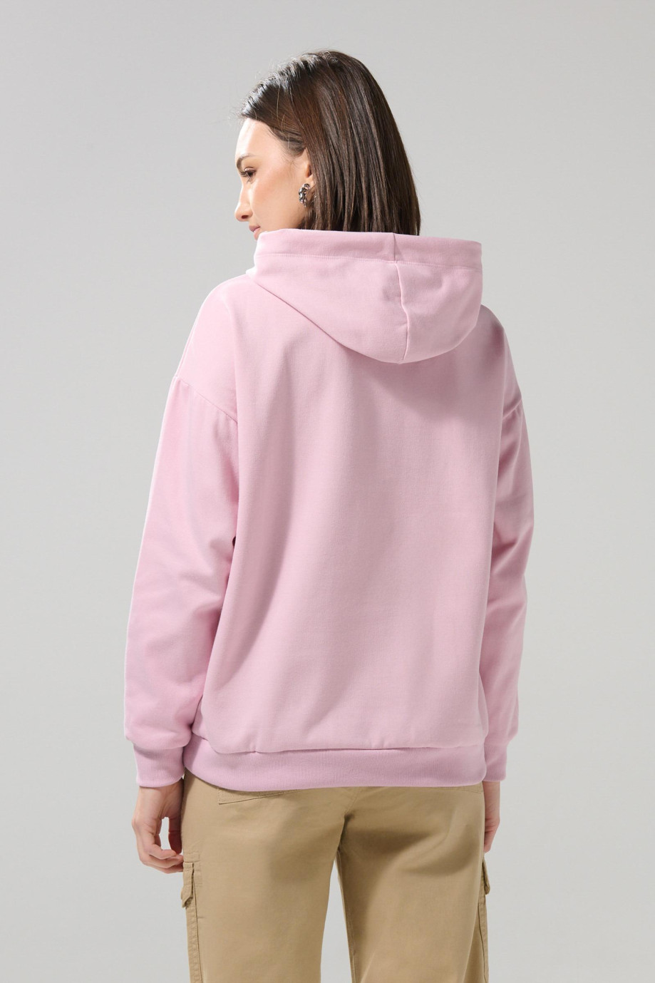 Buzo con capota para mujer en tono rosado claro cuenta con bordes de ruedo y puños en rib, diseño college localizado en frente, manga larga, hombro caído, cordón para anudar, bolsillo canguro y un fit oversize. El estilo streetwear de esta prenda será la mejor opción para lucir en los días fríos. ¡Con un jean cargo te verás estupenda!