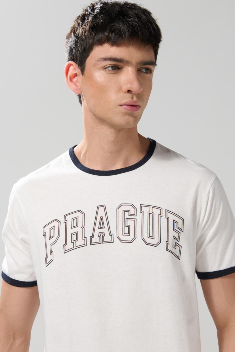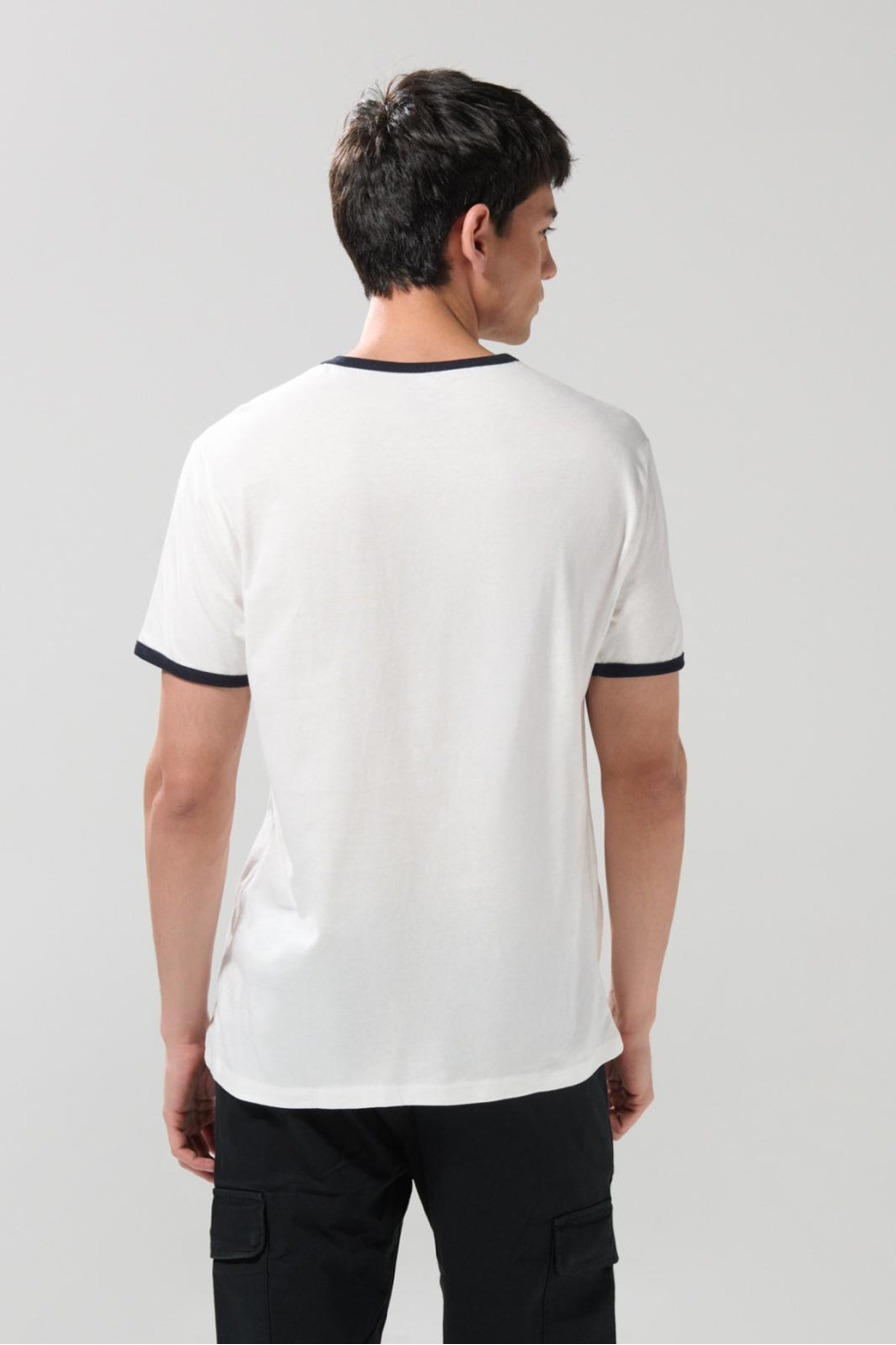 Camiseta crema clara para hombre cuenta con contrastes negros en puños y cuello redondo, manga corta, estampado college localizado en frente y un fit ligeramente ceñido al cuerpo. Crea atuendos esenciales combinando esta prenda con tus jeans o bermudas favoritas. ¡Lucirás en tendencia!