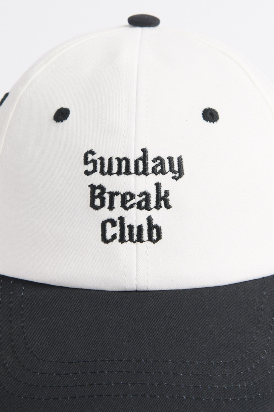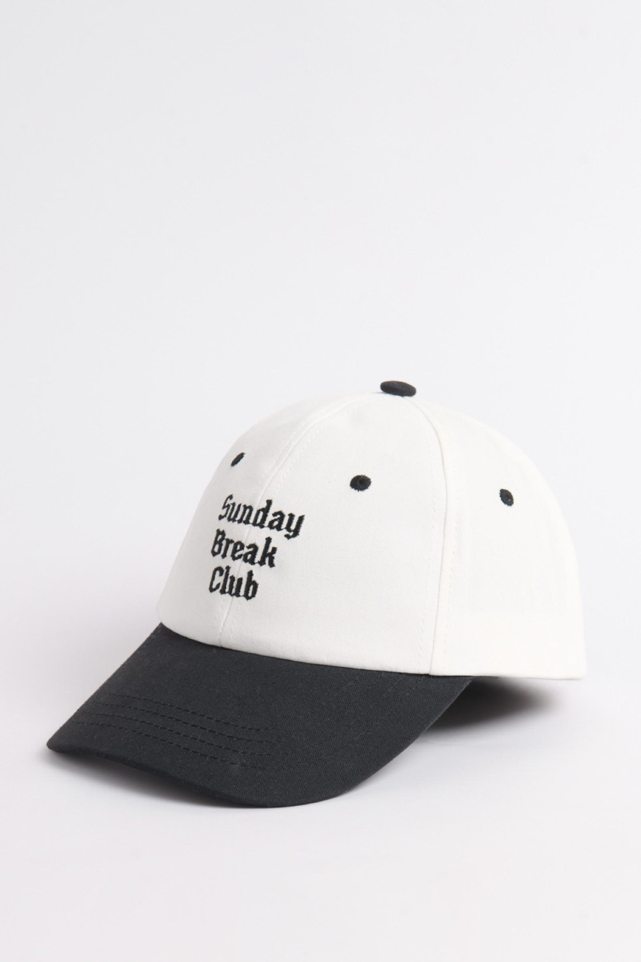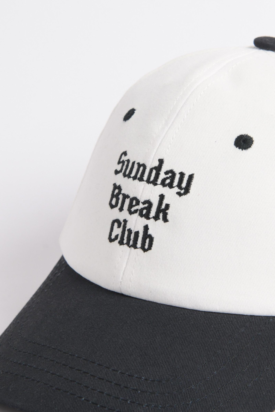 Cachucha con refuerzo, con visera, ojales y botón en contraste, cierre plástico, bordado en frente en gorra terminada y sesgo fo