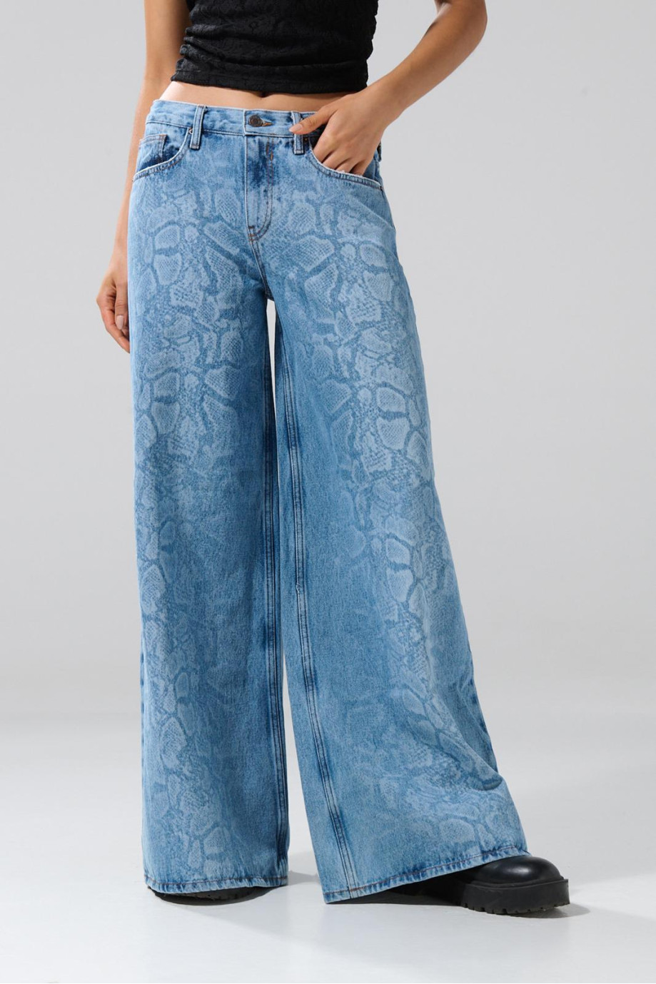 Jean azul medio tipo palazzo para mujer cuenta con 5 bolsillos, tiro alto, bota ancha, diseños localizados, pretina sencilla con botón metálico y una horma holgada en el cuerpo. Dale a tu outfit una pincelada de estilo combinando esta prenda con camisetas básicas. ¡Inspirarás a los demás con tu atuendo!