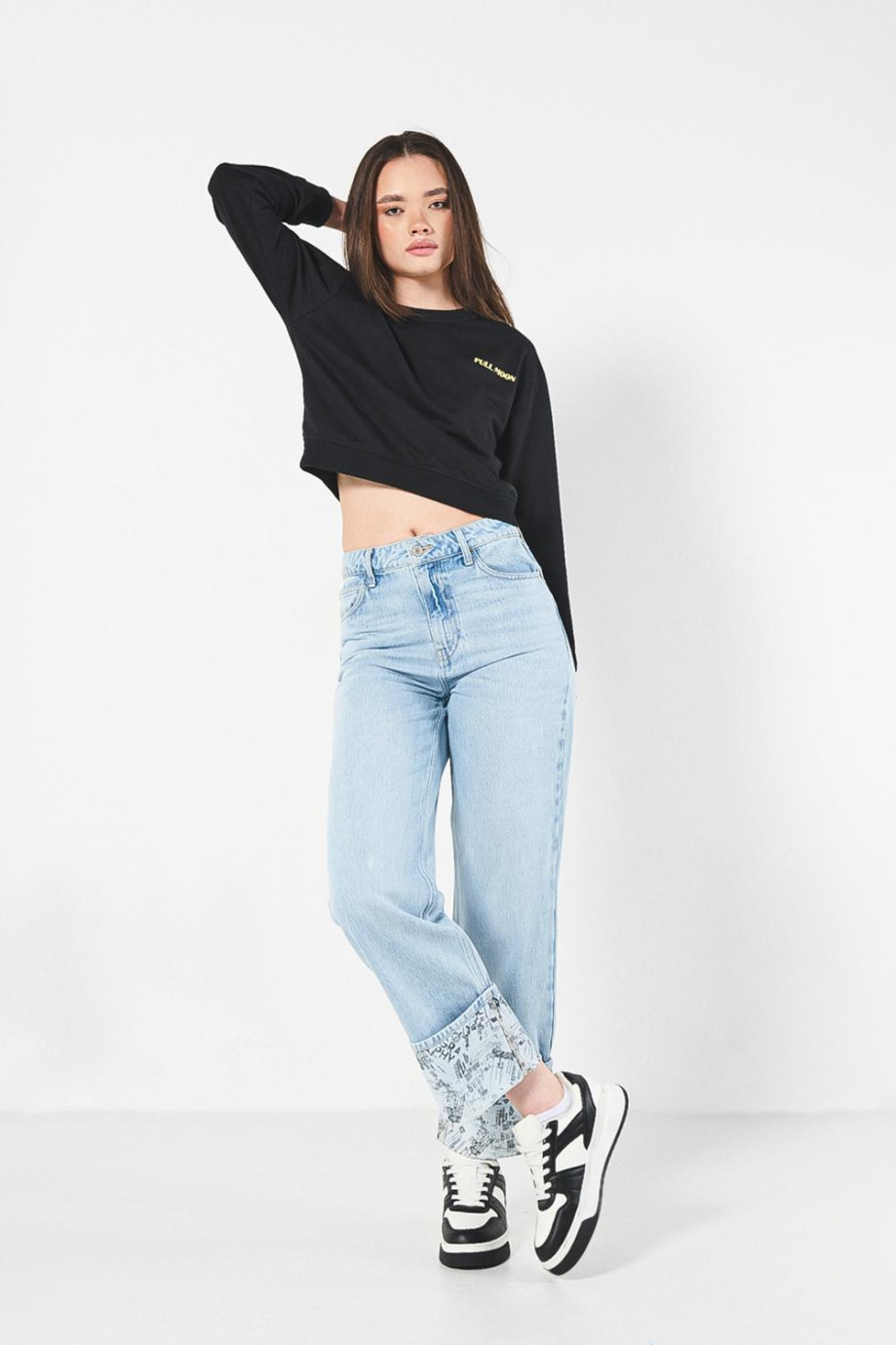 Jean para mujer tipo 90´S azul claro cuenta con 5 bolsillos, bota doblada hacia afuera con diseños estampados, tiro alto, botón en pretina y un fit holgado al cuerpo. Crea un look retro con esta prenda, combínala con un buzo oversize y dale a tu atuendo un toque vibrante. ¡Serás la sensación!