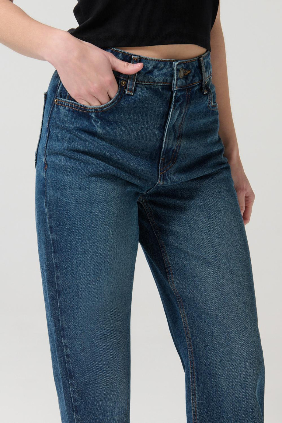 Jean azul oscuro tipo 90´S para mujer cuenta con cierre delantero con cremallera oculta, pretina con botón metálico visible, 5 bolsillos, bota recta, tiro alto y un ajuste holgado en el cuerpo. Resalta tu estilo retro combinándolo con una camiseta básica y un par de tenis planos, será perfecto para llevar a tus salidas con amigos.