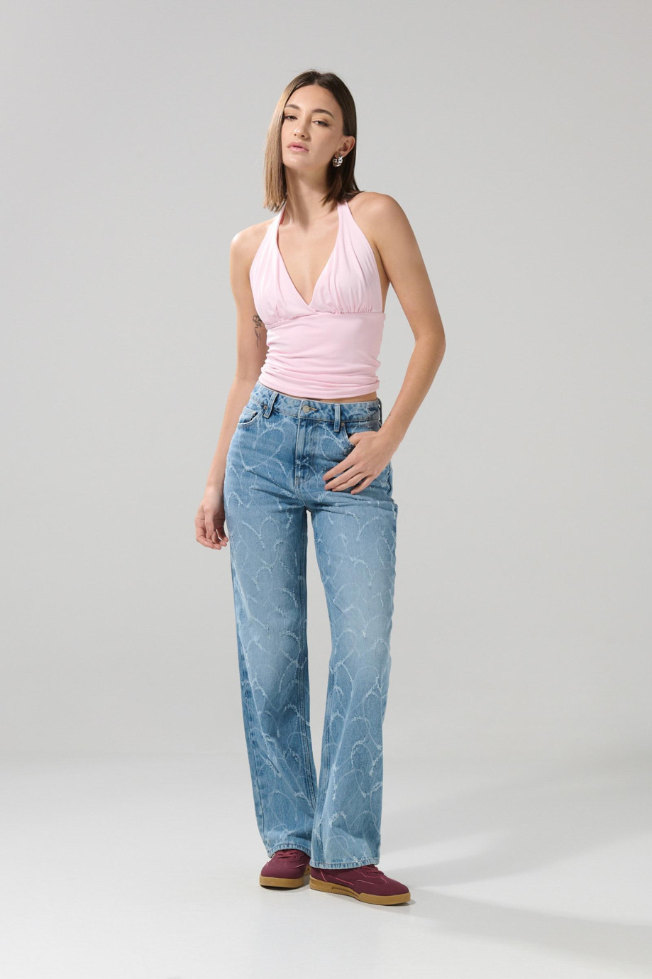 Jean 90´S para mujer en tono azul claro cuenta con 5 bolsillos, bota recta, tiro alto, diseños de corazones, pretina sencilla con botón metálico y una horma holgada en el cuerpo. Destácate con tu estilo en toda ocasión combinando esta prenda con tu mejor blusa estampada. ¡Crearás un outfit 100% juvenil!