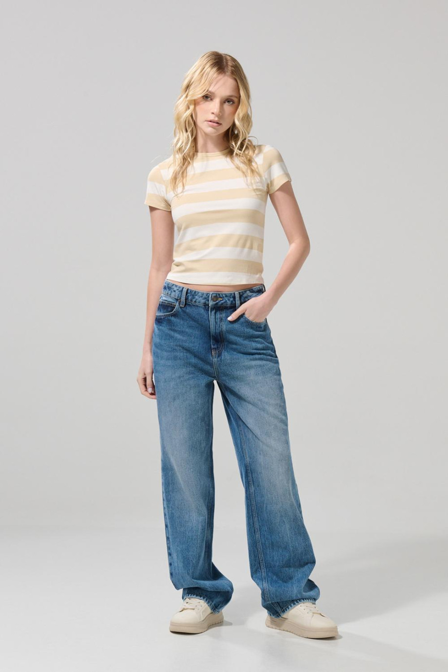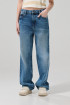 Jean azul medio tipo 90´S para mujer cuenta con 5 bolsillos funcionales, diseño de bota recta, tiro alto, pretina sencilla con botón metálico y una silueta holgada en el cuerpo. Crea tu mejor outfit retro combinando esta prenda con tus camisetas Koaj favoritas, así marcarás la diferencia en tu próxima salida con amigas.