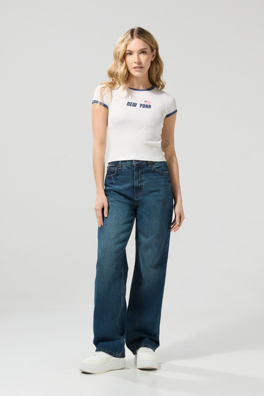 Jean 90´S azul oscuro bota recta con bolsillos y tiro alto