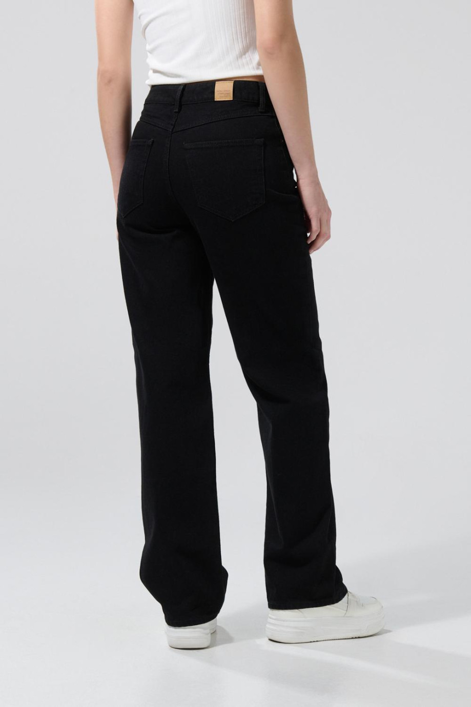 Jean 90´S para mujer en tono negro cuenta con 5 bolsillos funcionales, bota recta, tiro alto, sistema de cierre con cremallera oculta en frente y una silueta holgada en el cuerpo. ¿Qué tal si combinas esta prenda con una blusa blanca? Crearás un look minimalista ideal para una salida especial o una noche de fiesta con amigos.