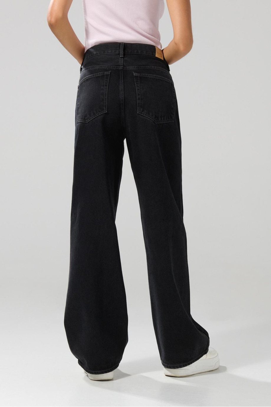 Jean baggy tiro medio gris con bolsillos y bota ancha