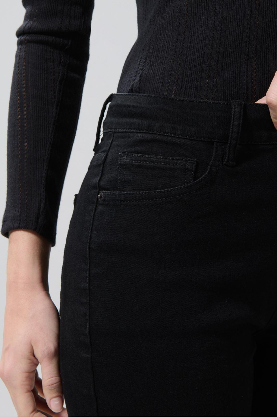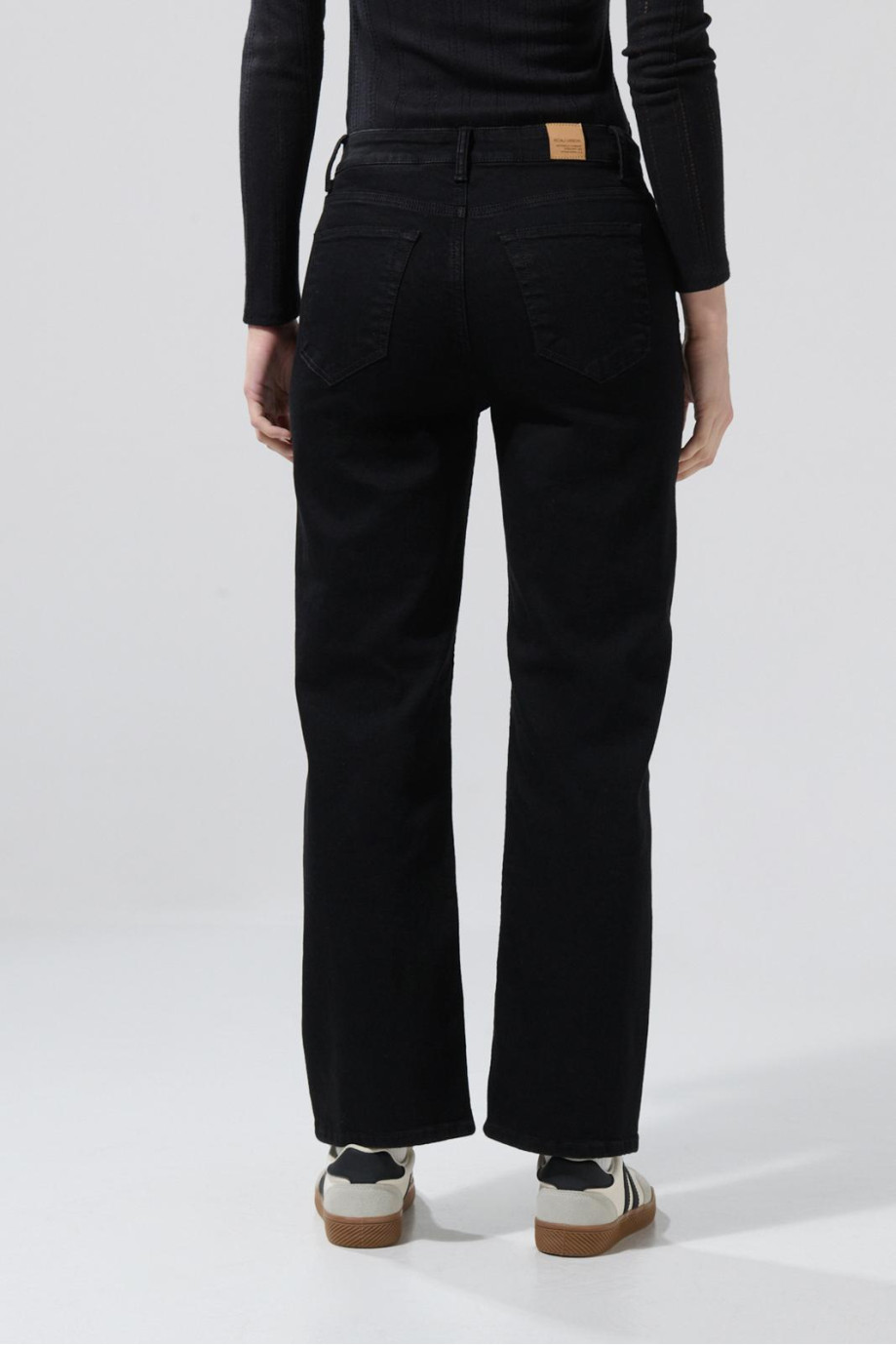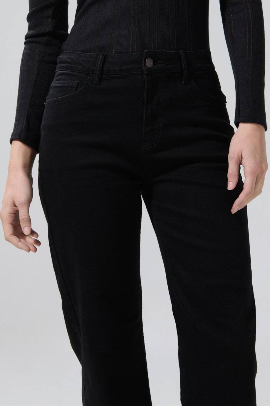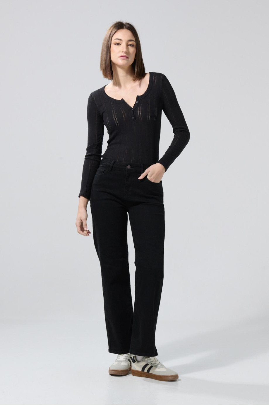 Jean straight leg negro para mujer cuenta con bota recta, tiro alto, 5 bolsillos, pretina sencilla con botón metálico, cierre con cremallera oculta en frente y un ajuste holgado en el cuerpo. Lleva las últimas tendencias de la moda en tu look combinando esta prenda con tu mejor camiseta blanca para disfrutar de tus salidas con amigos.