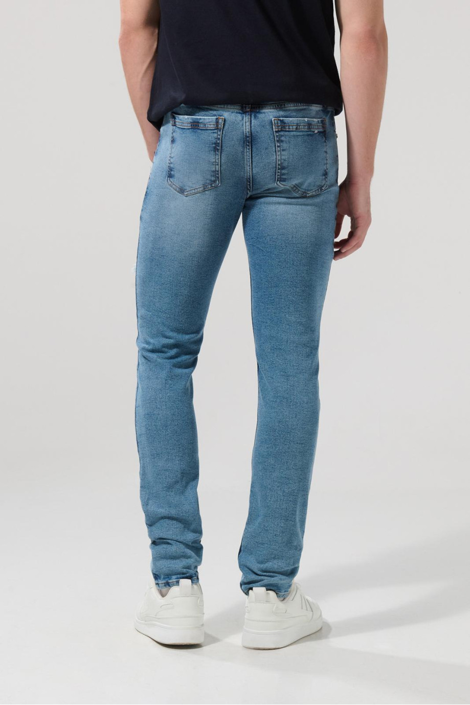 Jean skinny azul medio para hombre cuenta con tiro bajo, ligeros desgastes, 5 bolsillos, rotos localizados en frente, pretina con botón metálico y un ajuste ceñido al cuerpo. ¡Esta prenda está en tendencia! Lúcela con una camisa estampada y llévala para salir con tus amigos.