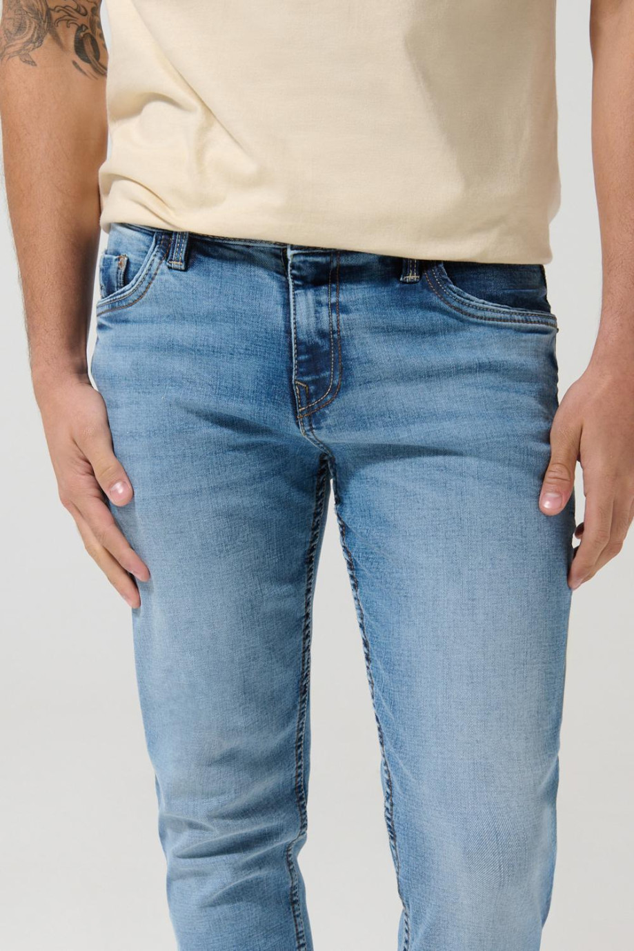 Jean skinny para hombre en tono azul medio cuenta con 5 bolsillos funcionales, ligeros desgastes localizados, tiro bajo, cierre con cremallera oculta en frente y una silueta ajustada al cuerpo. Esta prenda le dará un toque juvenil a tu estilo, lo que la convierte en la elección perfecta para lucir con tus camisas o camisetas KOAJ favoritas.