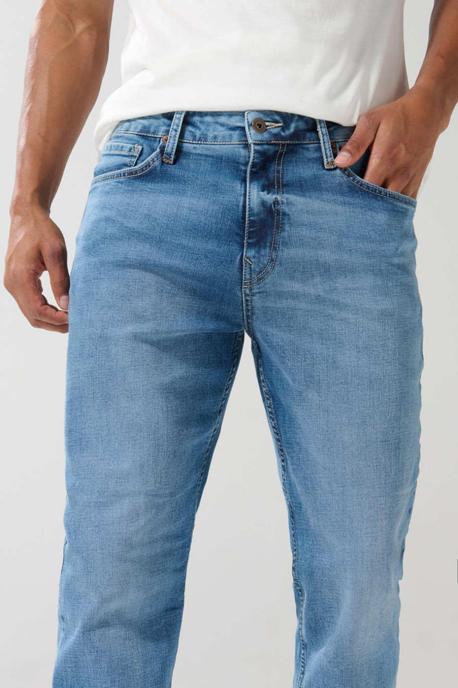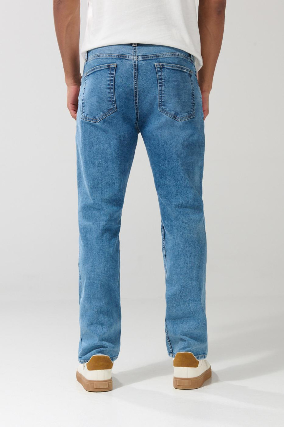 Jean straight leg para hombre en tono azul medio cuenta con 5 bolsillos funcionales, diseño de bota recta, ligeros desgastes localizados, tiro bajo y una silueta holgada en el cuerpo. Destácate con esta prenda en tus planes casuales, combínala con tu mejor buzo básico y crea un look retro con el que te sientas identificado.