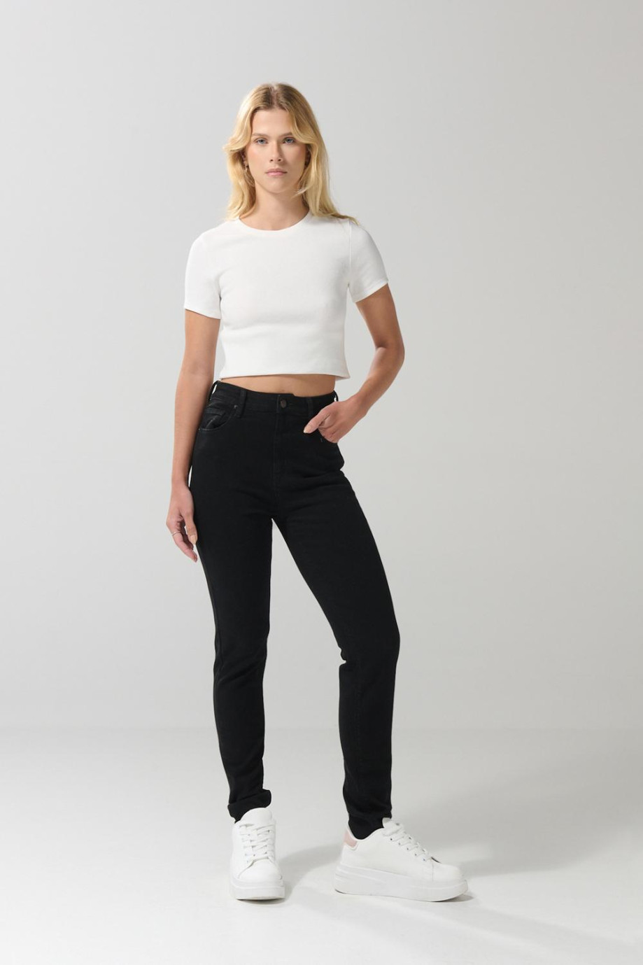 Jean jegging para mujer en tono negro cuenta con 5 bolsillos, súper tiro alto, pretina con botón metálico, cierre delantero con cremallera oculta y un ajuste ceñido a la silueta del cuerpo. Combínalo con una camiseta y un par de tenis blancos, así crearás un look minimalista con el que te destacarás.