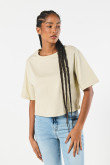 Camiseta kaki clara crop top para mujer, elaborada en tela de algodón, cuenta con hombro caído, manga corta amplia, cuello redondo y una silueta oversize en el cuerpo. Entra en la onda streetwear combinando esta prenda con tus jeans anchos favoritos, así lucirás a la moda en tus planes más descomplicados.