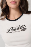 Camiseta manga corta para mujer en tono crema clara, confeccionada en tela de rib texturizada, cuenta con contrastes negros en cuello redondo y puños, diseño college en frente y una silueta ajustada al cuerpo. ¡Esta prenda está en tendencia! Combínala con un jean jegging y crea un total look perfecto para tu próxima salida con amigos.