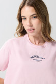 Camiseta crop top para mujer en tono unicolor cuenta con diseño college localizado en frente, cuello redondo, manga corta y una silueta ligeramente ajustada en el cuerpo. Esta prenda añade una pizca de encanto a tu outfit. ¡Con una falda o un jean push up estarás lista para destacarte en cualquier ocasión!