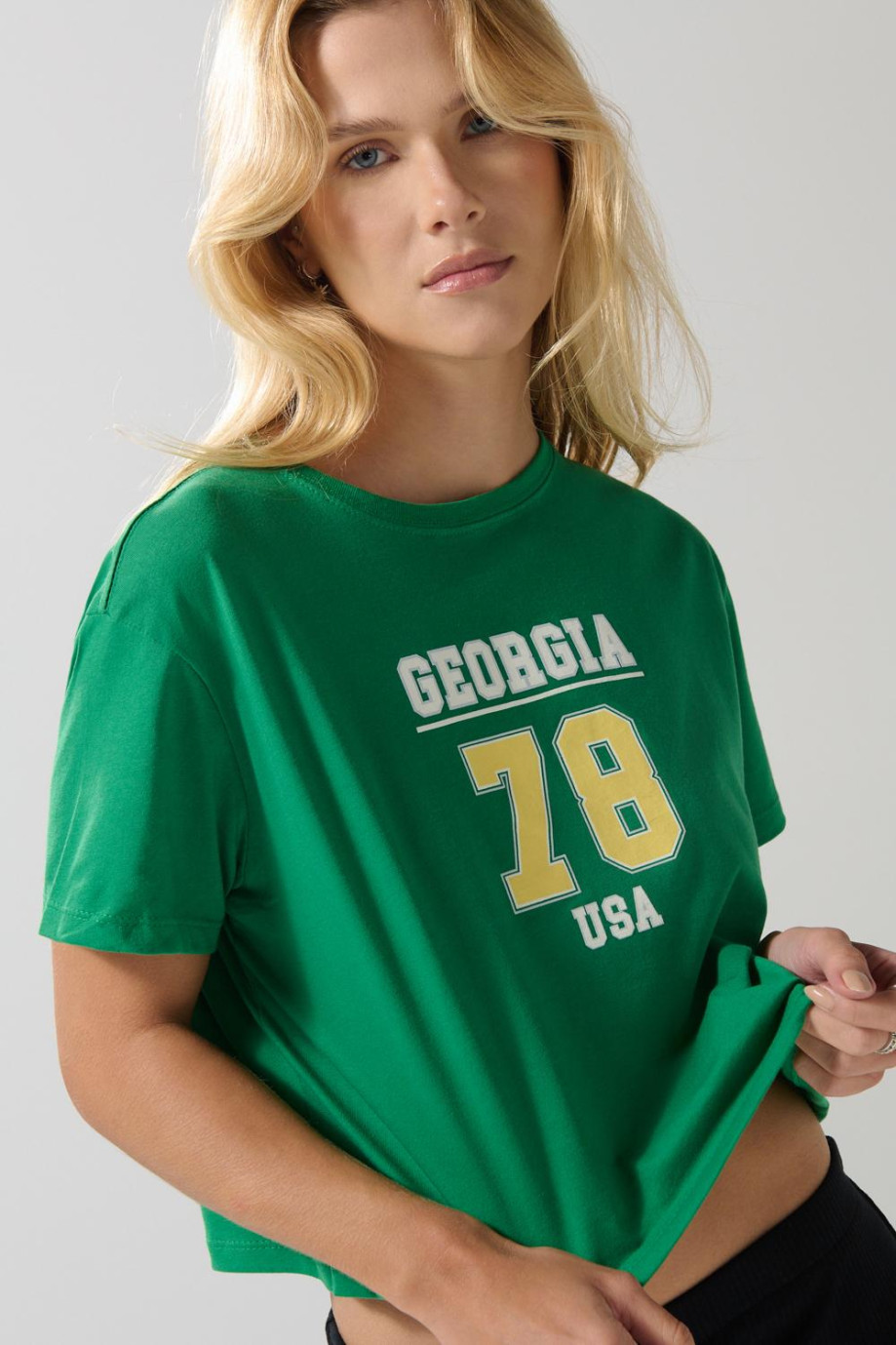Camiseta para mujer crop top verde oscura cuenta con cuello redondo, manga corta, diseño college estampado en frente y un fit que se ajustará al cuerpo en la medida precisa. Combínala con un short en jean y tus tenis más cómodos, así disfrutarás de tus planes de fin de semana con un total look tan genuino como tú.