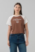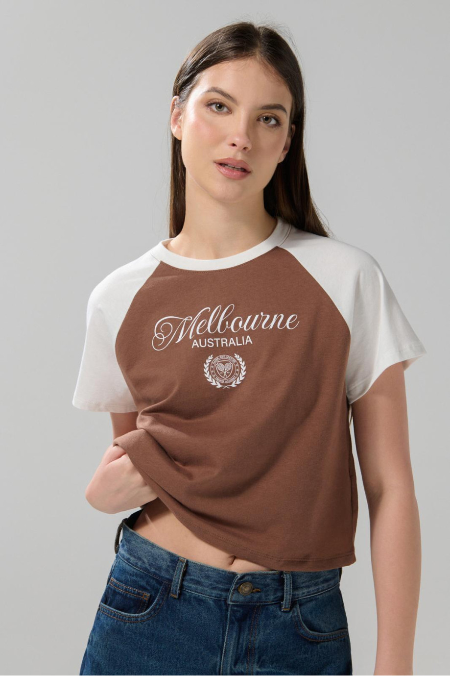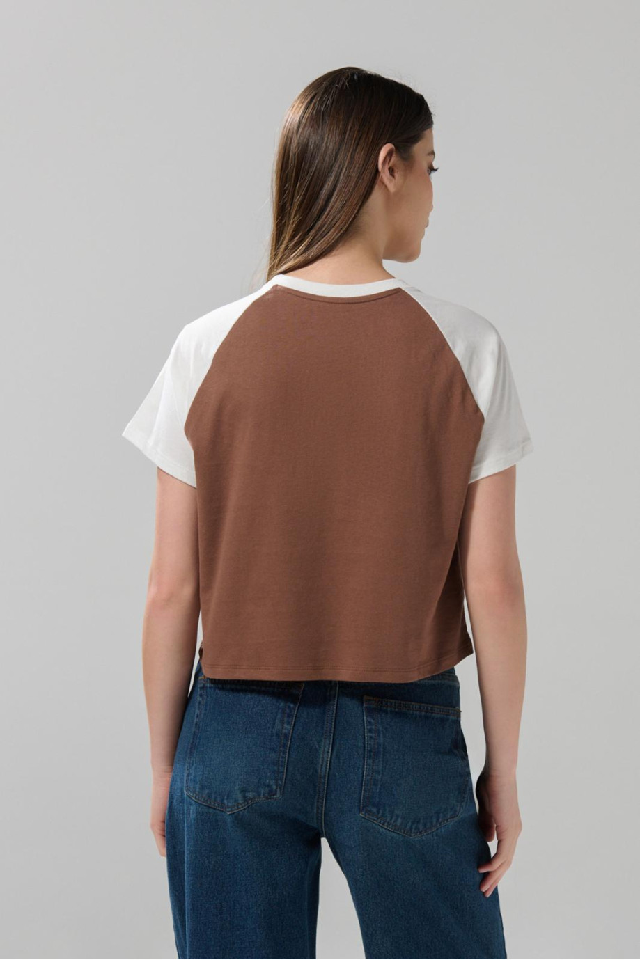 Camiseta para mujer en tono café medio cuenta con cuello redondo, texto college estampado en frente, manga ranglan corta en contraste y un fit ajustado al cuerpo. Lleva las últimas tendencias en tu total look combinando esta prenda con tu mejor jean KOAJ. ¡Lucirás espectacular!
