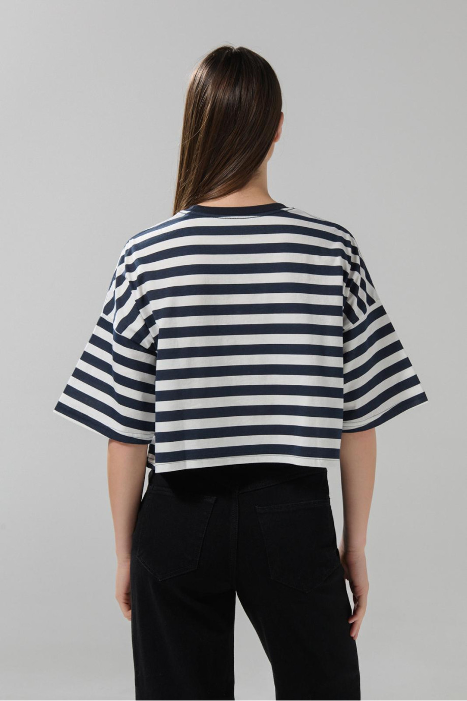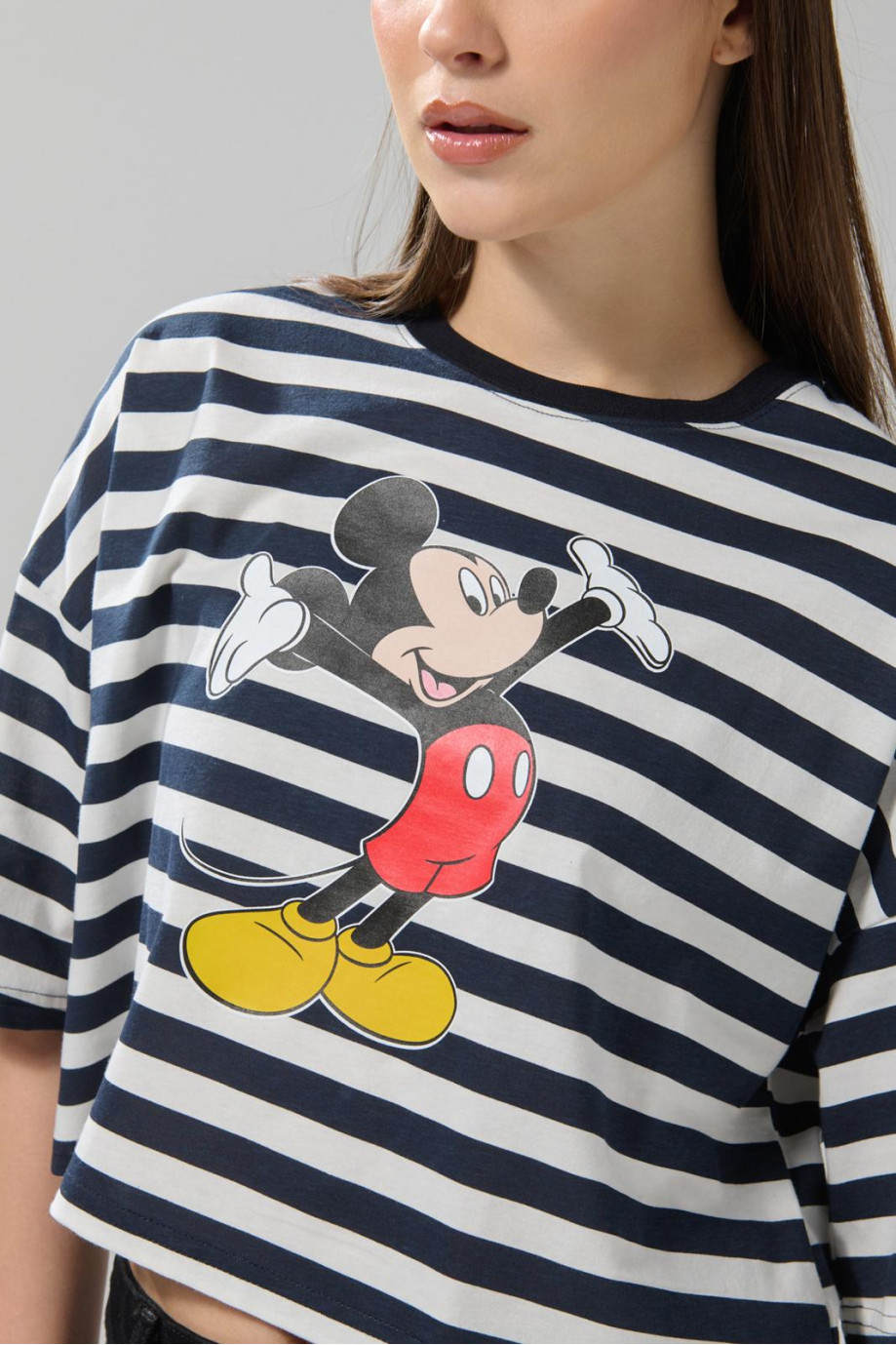 Camiseta crop top crema clara para mujer cuenta con cuello redondo, manga corta, hombro caído, diseño de Mickey (Disney) en frente, rayas negras continuas y una silueta oversize en el cuerpo. Dale un toque moderno a tu look combinando esta prenda con tus jeans o faldas favoritas, así serás la sensación en todos tus planes.