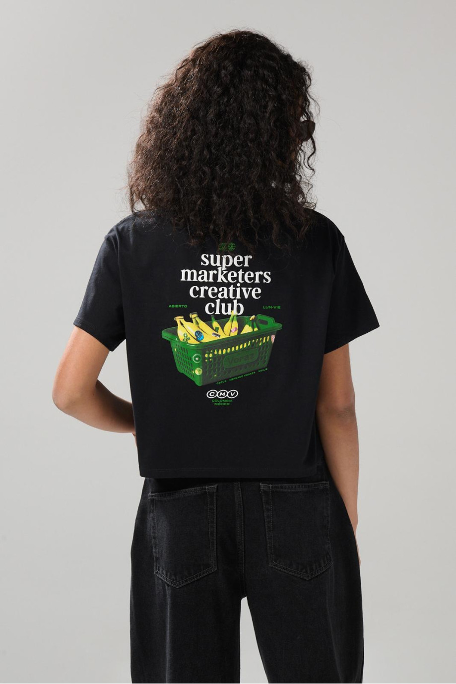 Camiseta crop top para mujer con arte en el frente de Copu, una prenda ideal para usar con falda y short