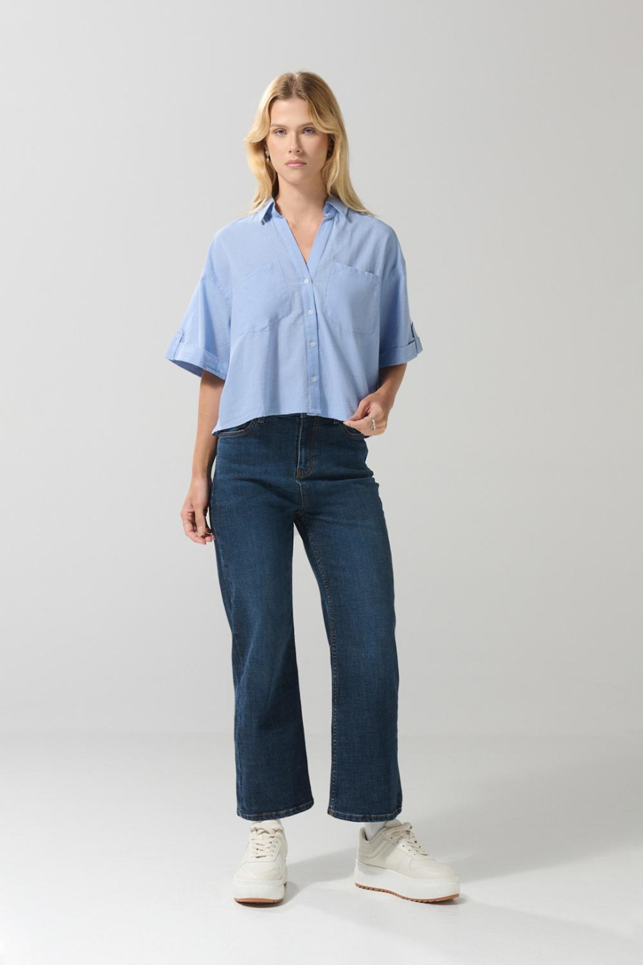 Blusa unicolor con botones, doble bolsillo y manga corta