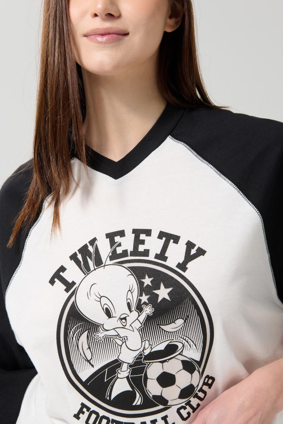 Camiseta crop top crema clara para mujer cuenta con diseño de Piolín (Looney Tunes) en frente, cuello V, manga ranglan corta en contraste y una horma oversize en el cuerpo. Eleva tu look a niveles sorprendentes luciendo esta prenda con un jean push up, así inspirarás a los demás con tu estilo.