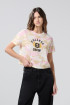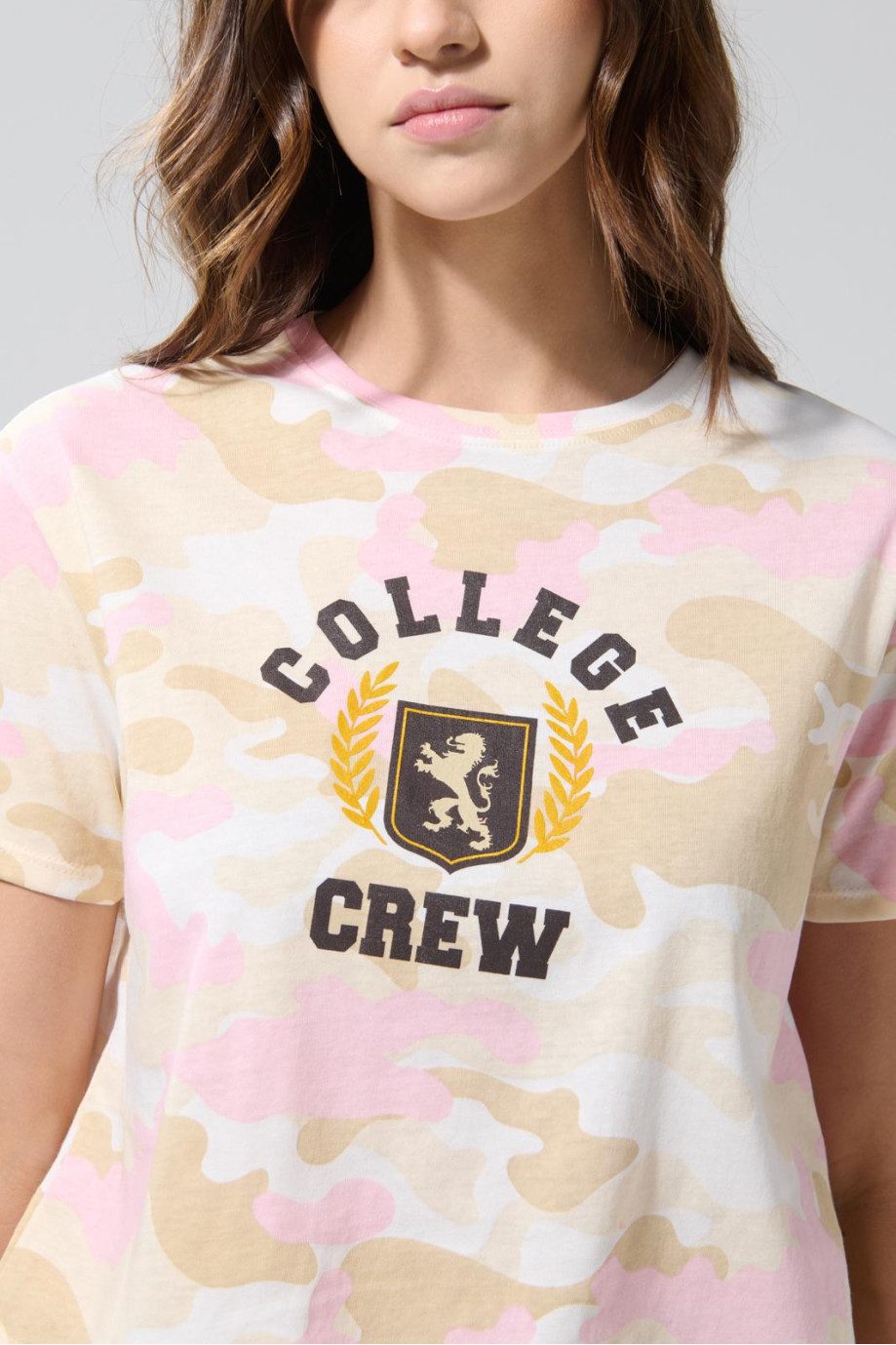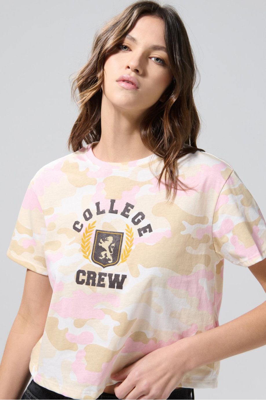 Camiseta crop top crema clara para mujer cuenta con cuello redondo, manga corta, estampado college en frente, diseños camuflados continuos y una silueta ligeramente ajustada al cuerpo. Dale un toque llamativo a tu outfit con esta prenda, lúcela con una falda de jean y vibra con tu estilo en todo momento.