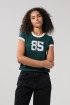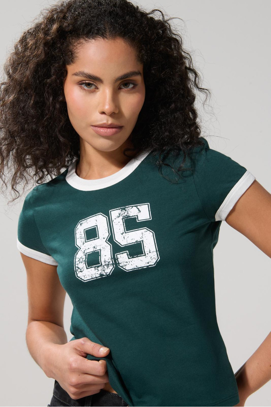 Camiseta para mujer en tono verde oscura cuenta con contrastes blancos en puños y cuello redondo, manga corta, diseño college numérico en frente y una silueta ajustada al cuerpo. Entra en la onda universitaria combinando esta prenda con tus jeans KOAJ favoritos, así lucirás a la moda en tus planes más descomplicados.