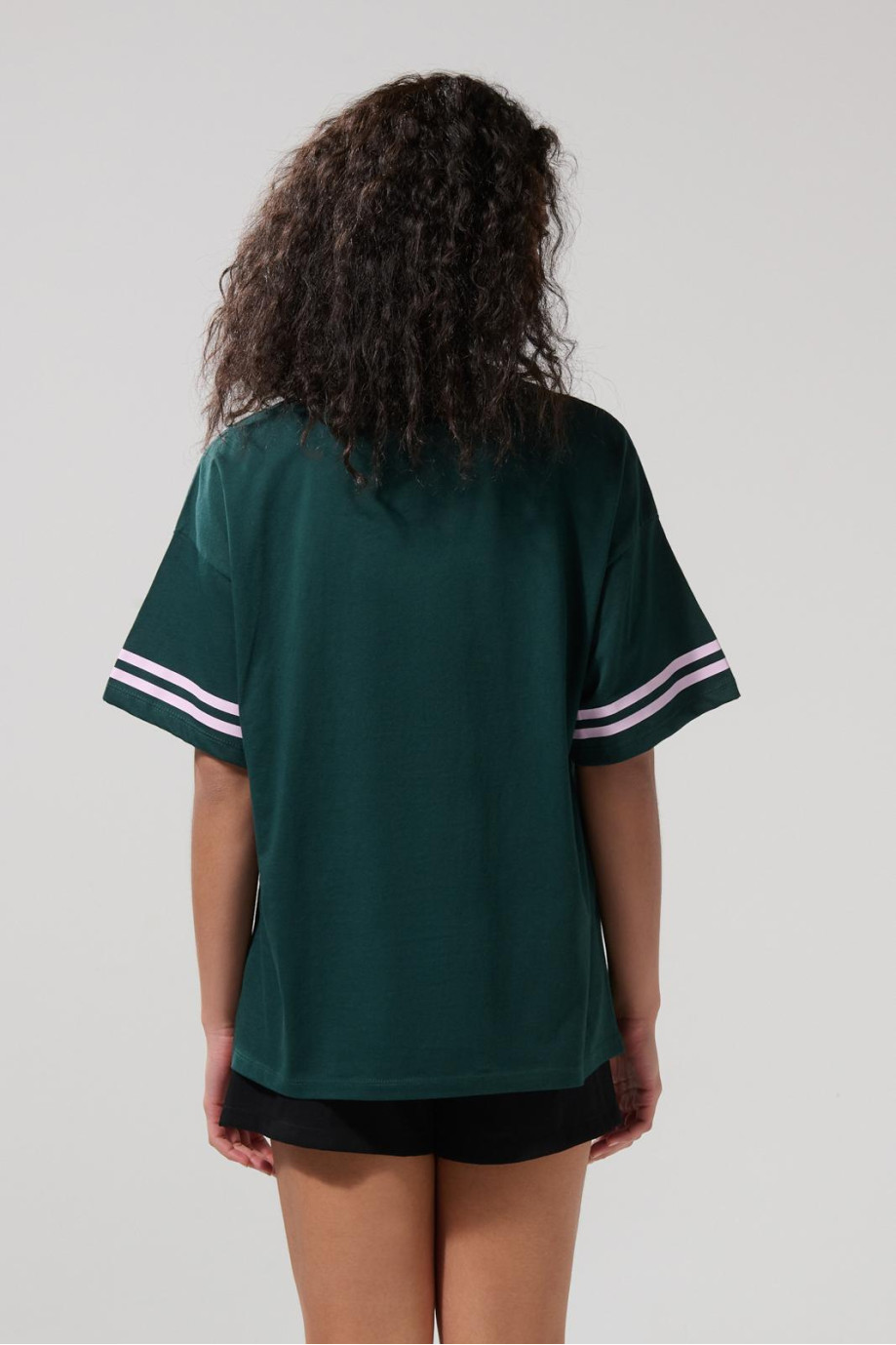 Camiseta cuello redondo verde oscura para mujer cuenta con hombro caído, manga corta con rayas en contraste, diseño college estampado en frente y una silueta oversize en el cuerpo. Perfecta para los planes casuales, podrás combinarla con tu mejor jean y brillar con tu look. ¡Serás la sensación!