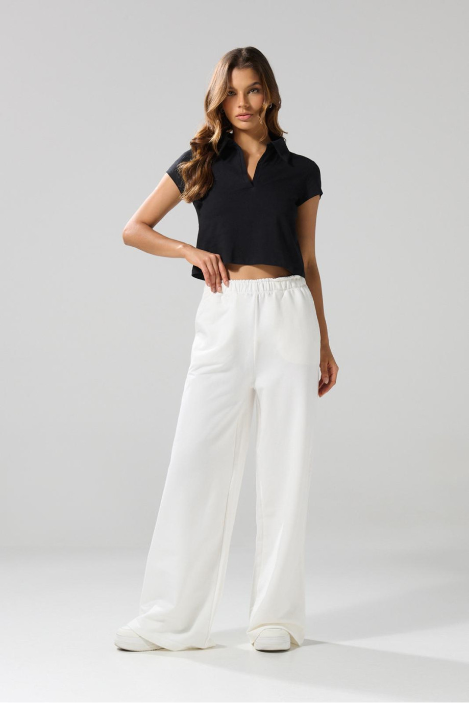 Camiseta unicolor crop top para mujer cuenta con manga corta, cuello tipo polo, escote en V y un fit que se ajustará al cuerpo en la medida precisa. ¡Esta prenda resaltará todo tu estilo moderno! Con un jean push up y un par de tenis altos crearás una combinación que amarás.