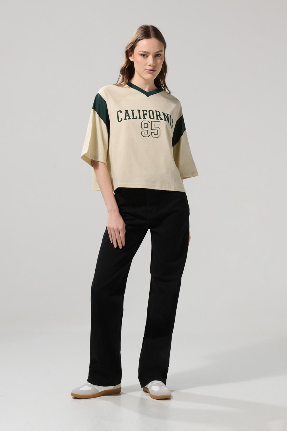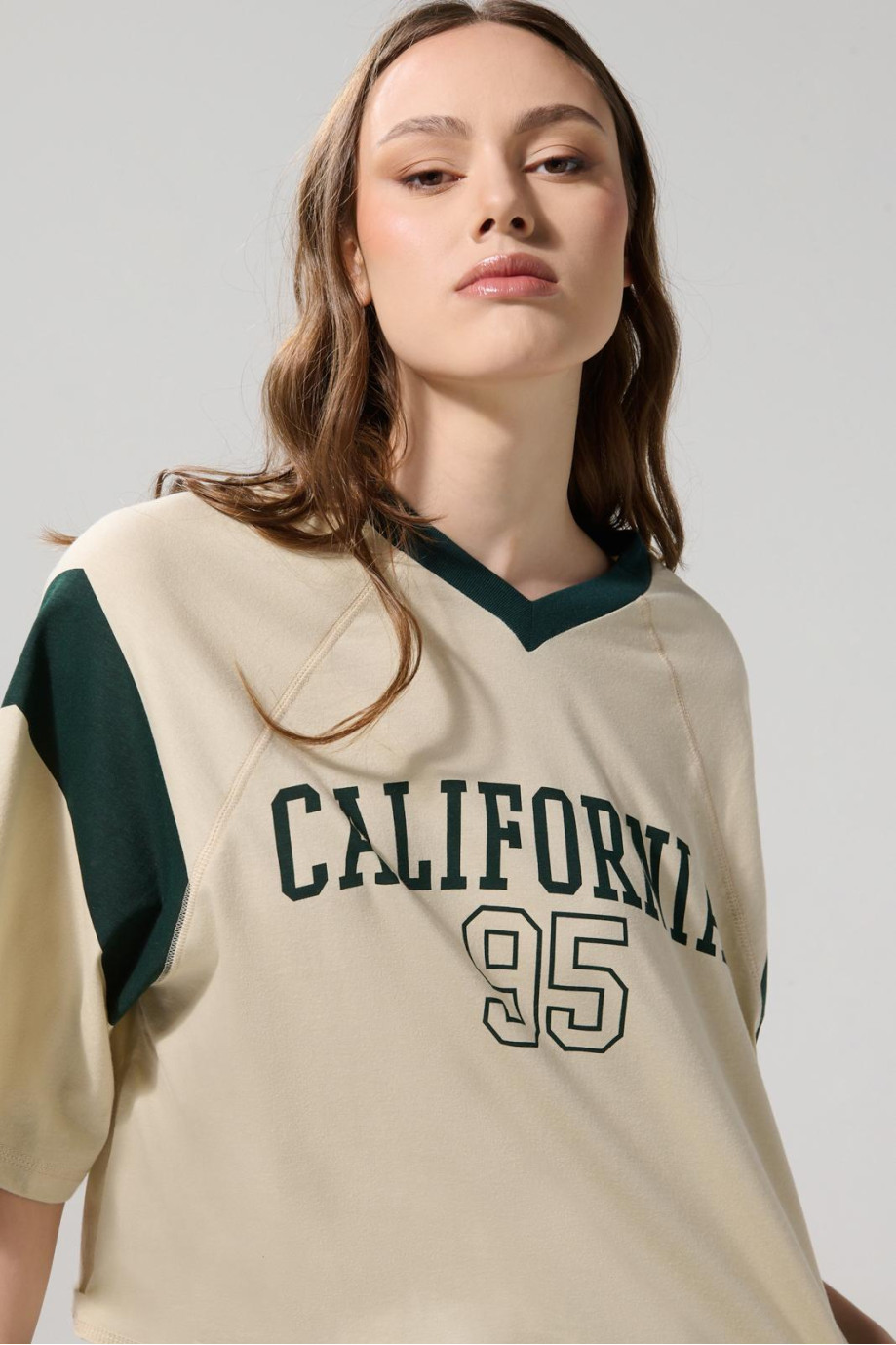 Camiseta crop top para mujer en tono kaki clara cuenta con cuello V en contraste, hombro caído, manga corta con franjas verdes, diseño college en frente y una silueta oversize en el cuerpo. ¿Buscas una prenda que combine bien con todo? ¡Esta es la indicada! Con un jean push up y un par de tenis altos crearás un look fantástico.