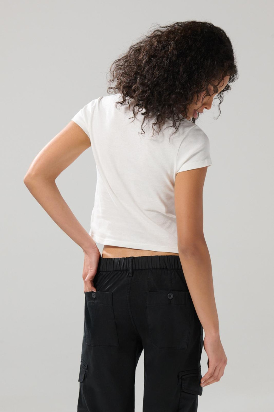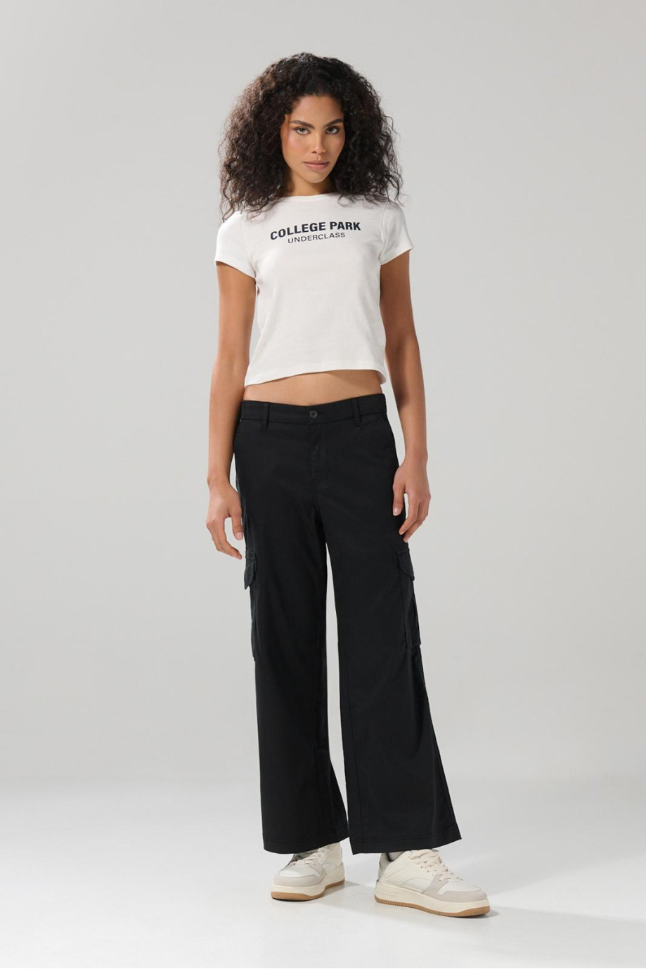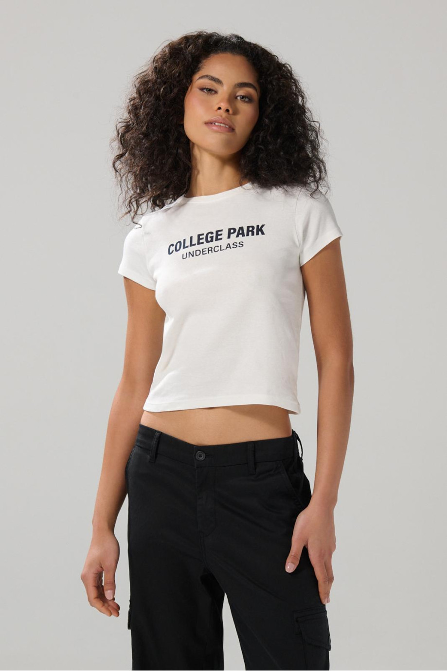 Camiseta manga corta para mujer en tono crema clara, confeccionada en tela acanalada, cuenta con cuello redondo, texto college en frente y una silueta ajustada en el cuerpo. Ideal para lucir con jeans o faldas, será el complemento que necesitas para sentirte cómoda en tus planes diarios o casuales.