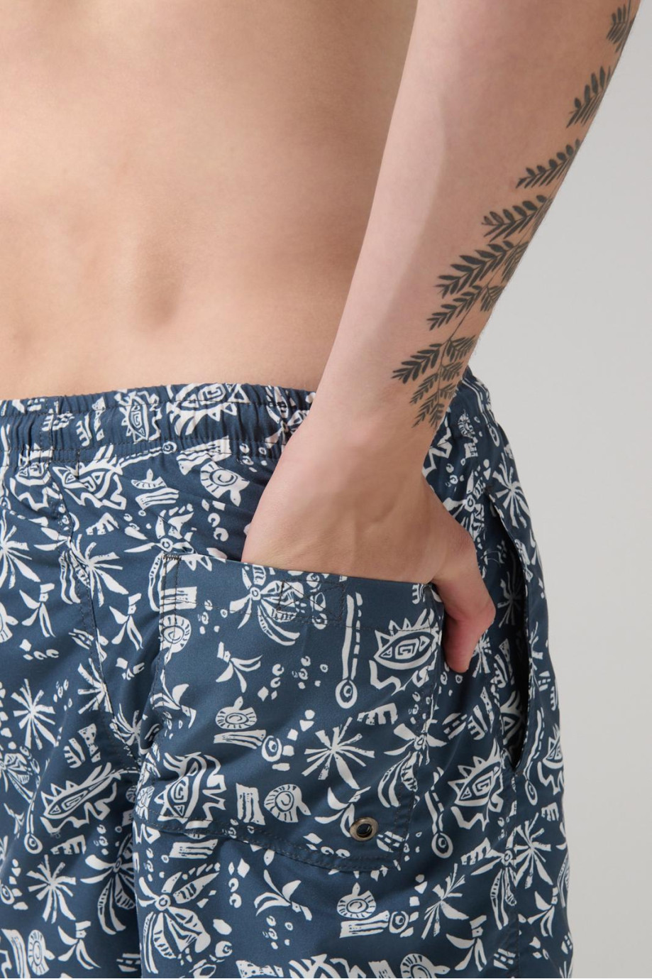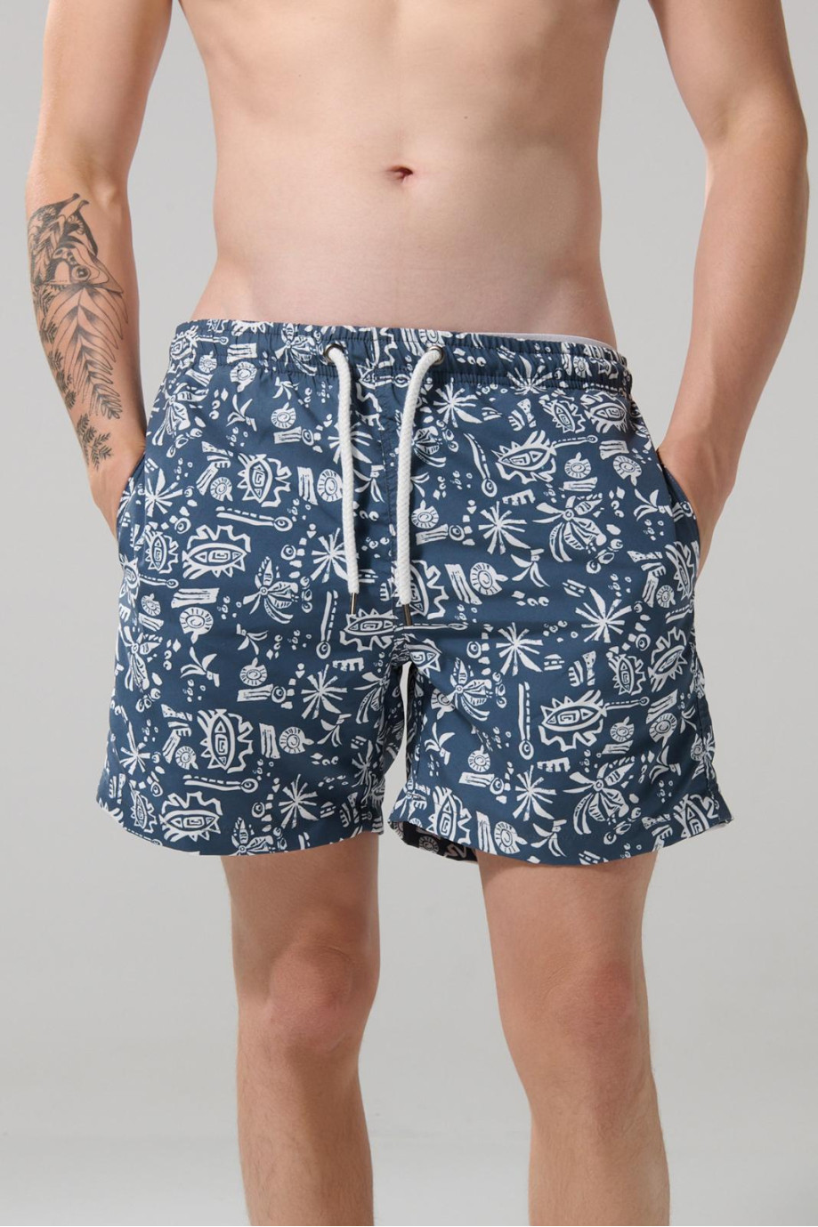 Bermuda azul medio tipo playera para hombre cuenta con diseños blancos estampados, tiro bajo, cordón en la pretina, 2 bolsillos laterales y un fit ligeramente ajustado al cuerpo. Combínala con una camiseta sin mangas y un sombrero, así crearás un look en tendencia perfecto para tus vacaciones de verano.