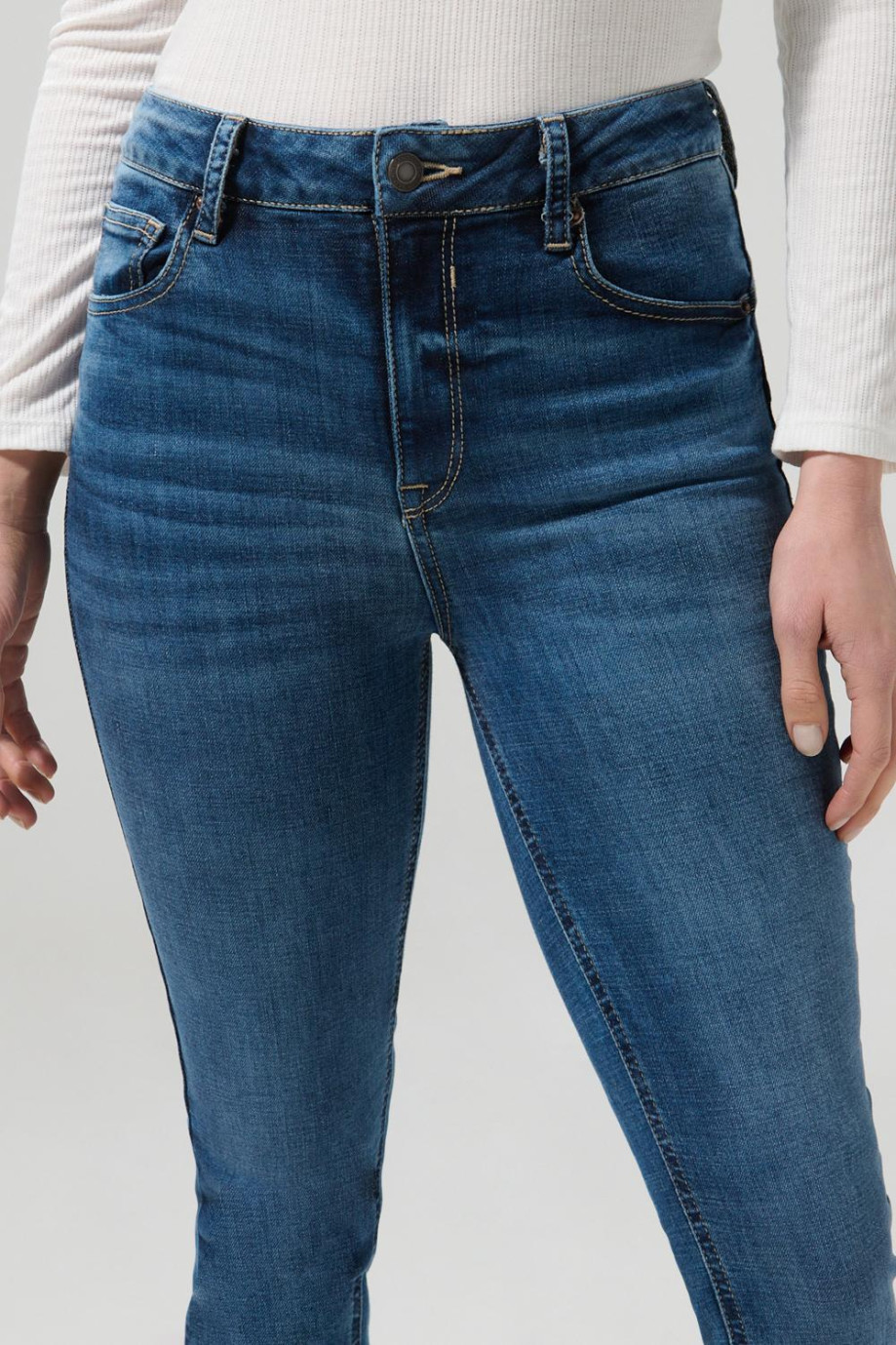 Jean push up para mujer en tono azul medio cuenta con realce posterior con sistema de pinzas, 5 bolsillos, ligeros desgastes localizados, pretina con botón metálico y un ajuste ceñido al cuerpo. Lleva un look estilizado combinando esta prenda con blusas o camisetas crop top. ¡Serás la inspiración de los demás!